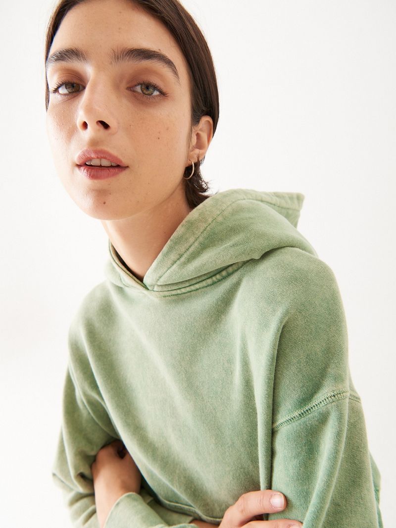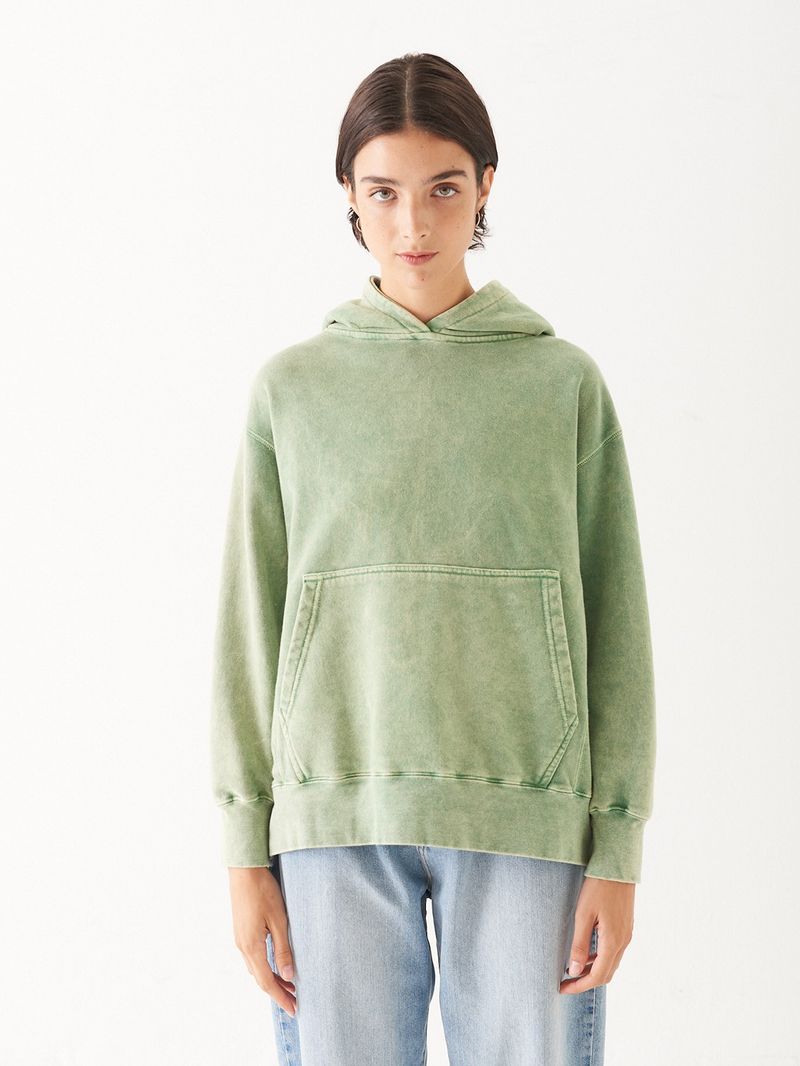 Buzo oversized de rústico de algodón con lavado acid wash. Tiene cuello redondo y detalle de grifa de marca en ruedo. Calce de hombros relajado y mangas amplias. Largo hasta la cadera. /Altura modelo: 1,77 m Talle: S / Composición: 90% Algodón 10% Poliéster / Origen: Nacional