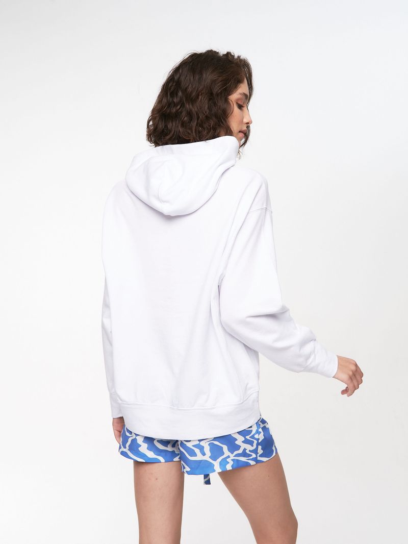 Buzo canguro en rústico de algodón con capucha, cordón y bolsillo delantero con etiqueta de logo. Calce oversize.• Altura modelo: 1,77 m Talle:M • Composición: 95% Algodón 5% Elastano Origen: NACIONAL