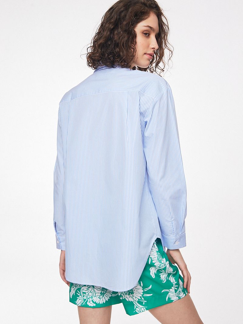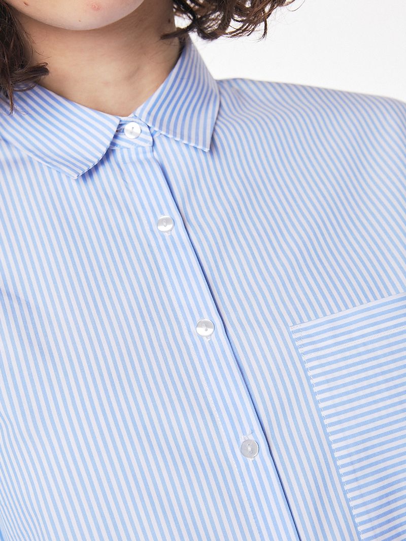 Camisa amplia manga larga en tela de algodón rayado. Calce suelto con ruedo curvado y bolsillo en delantero. Acceso por medio de botón y ojal. Largo hasta la cadera.• Altura modelo: 1,77 m Talle: S • Composición: 100% Algodón • Origen: Importado