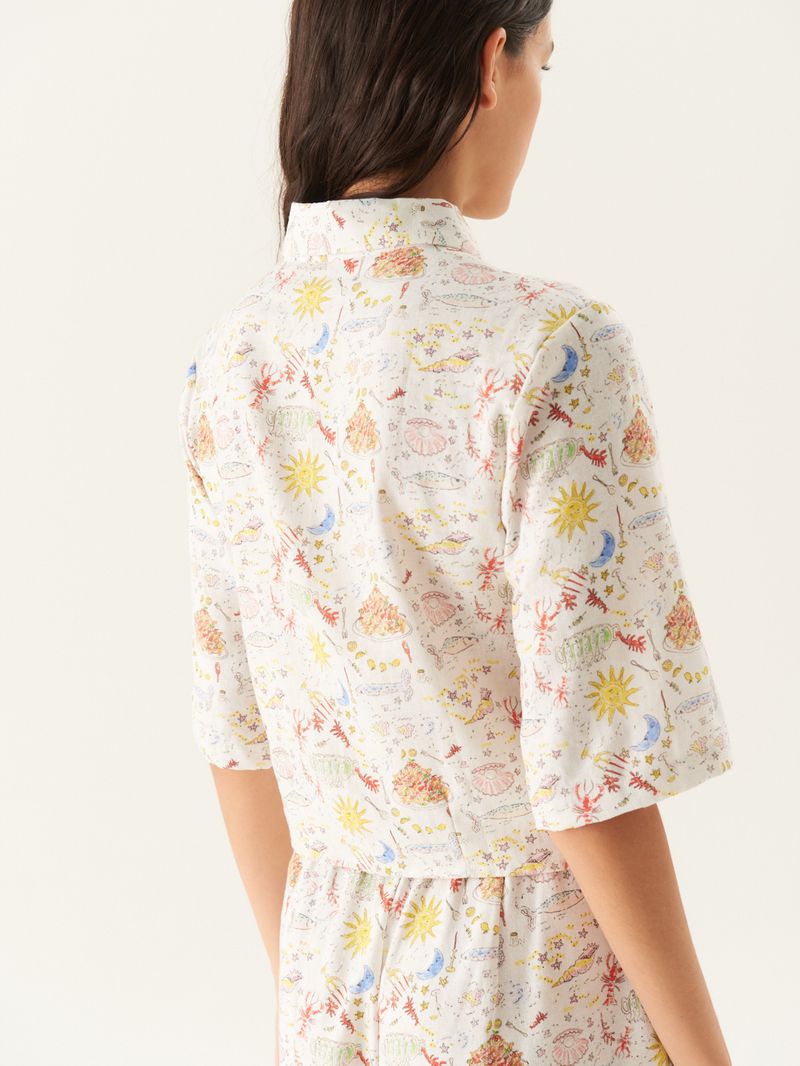 Camisa de lino viscosa estampada con print exclusivo de la colección, en colaboración con la artista Barbara Saenz. El calce es amplio con manga al codo y tiene una tabla en espalda. Acceso por medio de botón y ojal ocultos. Largo hasta la primera cadera. / Altura modelo: 1,77 m Talle: S / Composición: 100% Poliéster / Origen: Importado