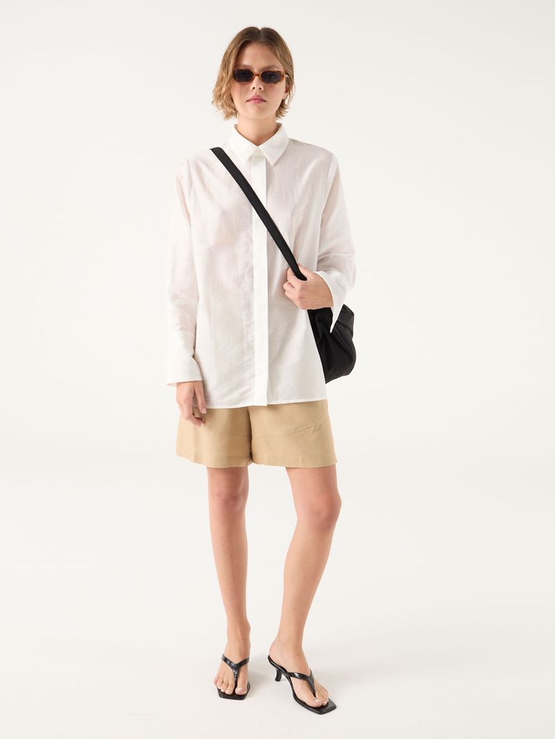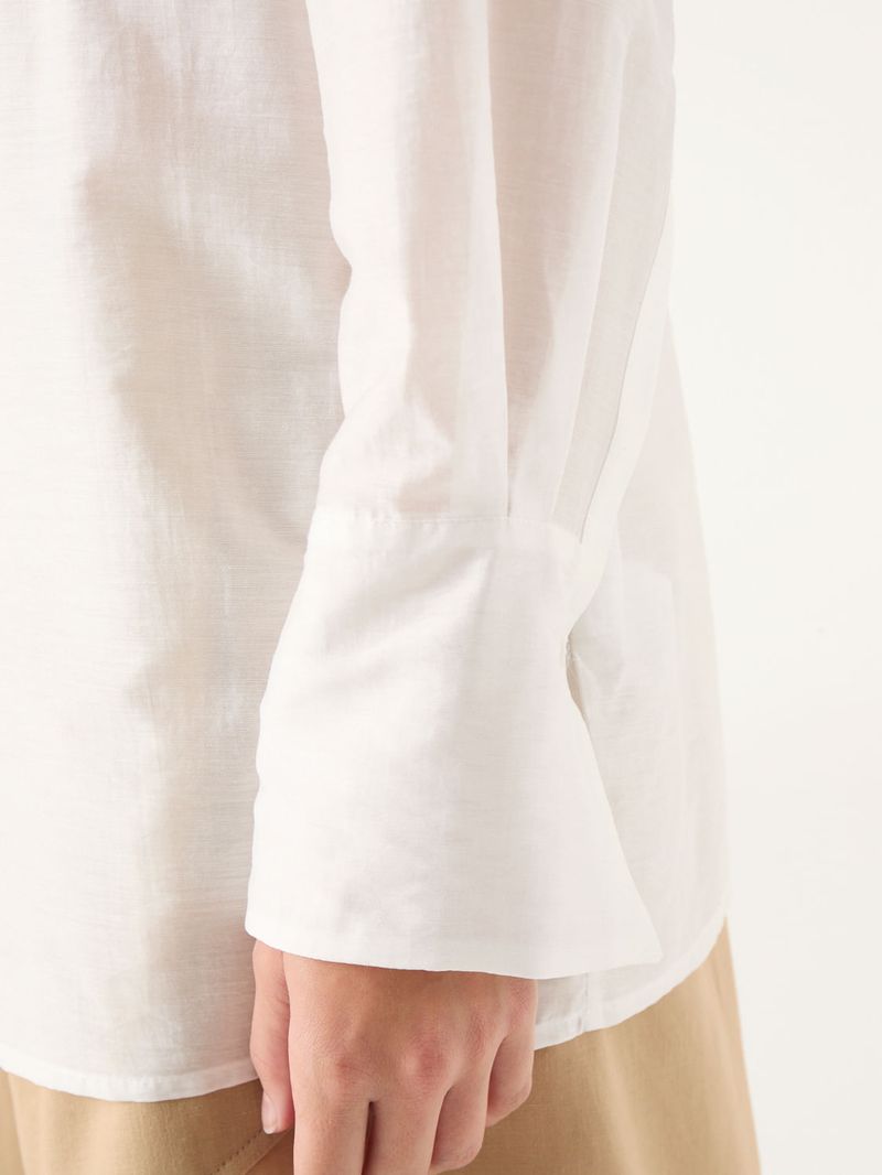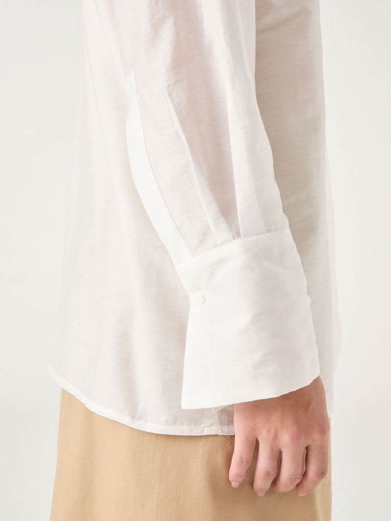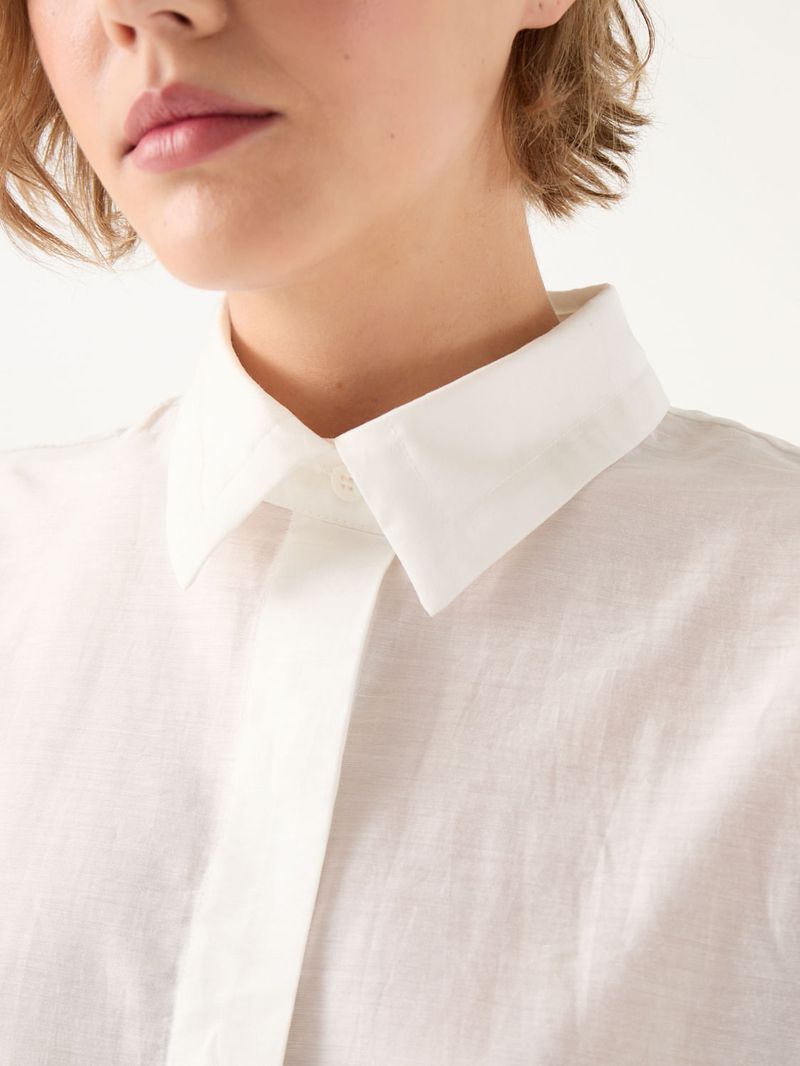 Camisa larga de voile con calce recto. Lleva catera con botones escondidos y presilla para colgar en espalda. Detalle de botones grabados con logo de marca. / Altura modelo: 1.77 m / Talle: S/ Composición: 40% Algodón 43% Tencel 17% Nylon / Origen: Importado