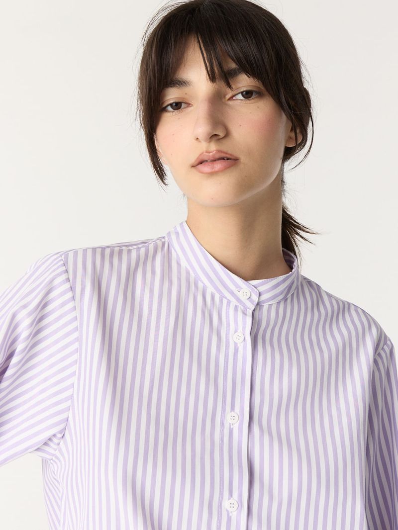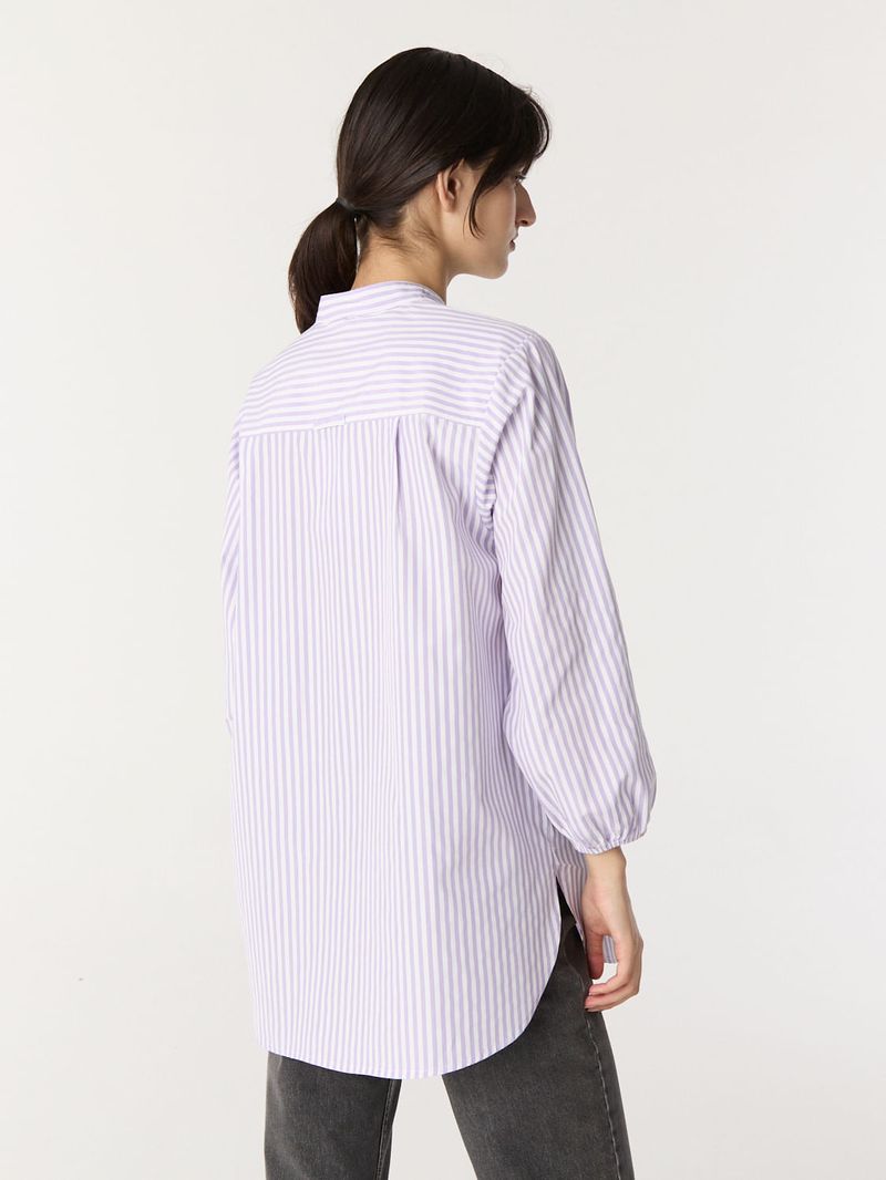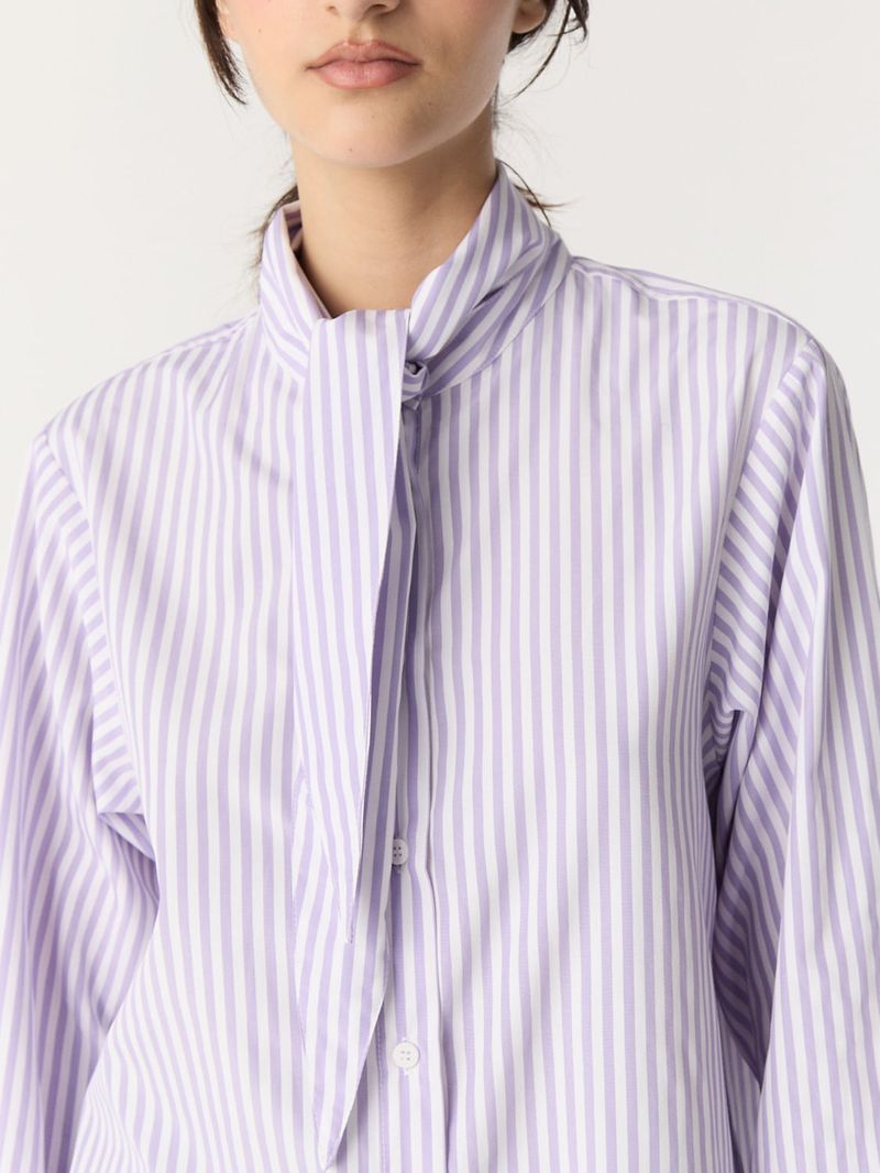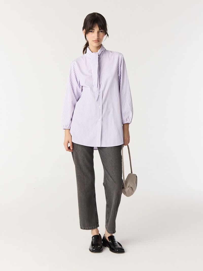 Camisa de poplin rayado con detalle de pañuelo desmontable en escote. Tiene mangas globo con puños fruncidos con elastico y ruedo curvo. El calce es regular y largo por debajo de la cadera. • Altura modelo: 1.77 m Talle: S • Composición: 100% Algodón • Origen: Importado