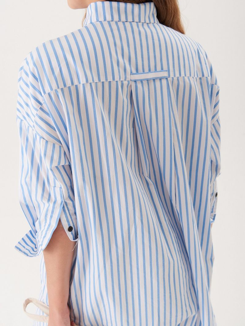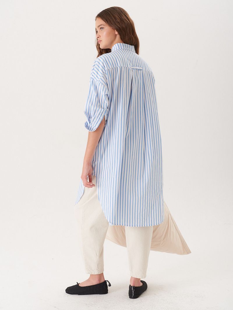 Camisa larga de poplin de algodón rayado. El calce es amplio, con sisa amplia y tabla cuadrada en espalda con presilla para colgar. Tiene tajos laterales con detalle de recorte rectangular, y es larga hasta la rodilla. / Altura modelo: 1,74 m / Talle: S/ Composición: 100% Algodón / Origen: Nacional