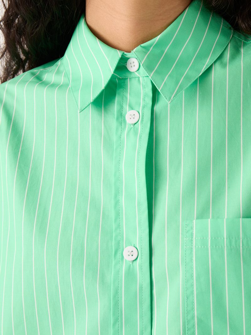 Camisa holagada de poplin de algodón rayado. El calce es amplio, con sisa amplia y tabla cuadrada en espalda. Detalle de etiqueta de marca en cuello espalda y botones grabados. / Altura modelo: 1,73 m / Talle: S / Composición: 100% Algodón / Origen: Importado
