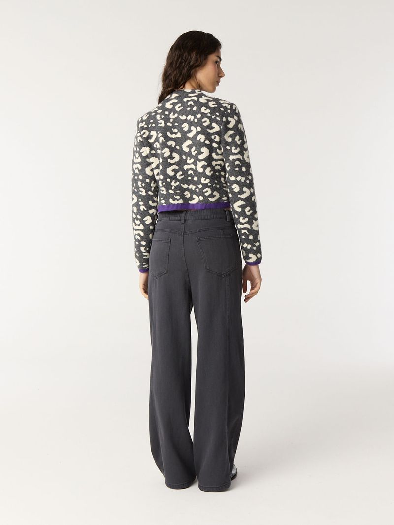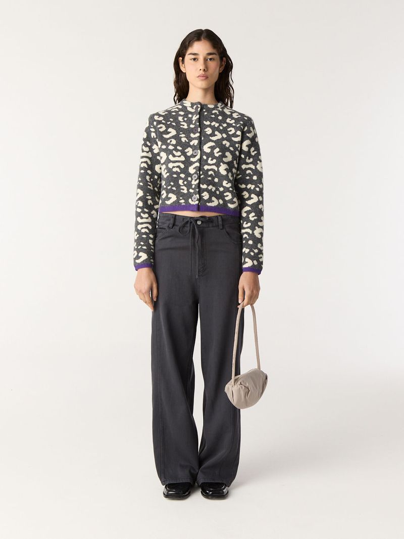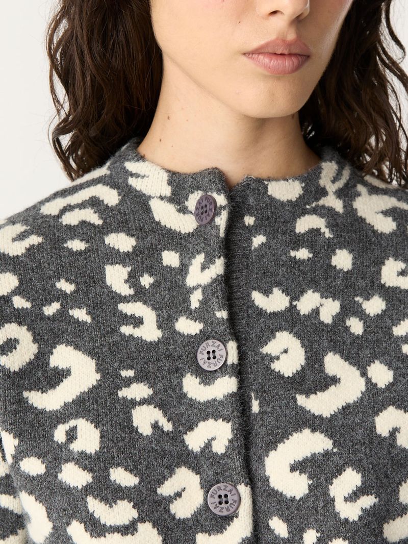 Cardigan tejido con diseño de animal print y detalle de puños a contratono tanto en bajo como en mangas. El calce es regular con escote trepado. El acceso es mediante botones grabados a tono y el largo por arriba de la cadera. / Altura modelo:1,70 m Talle: S / Composición: 42% Acrilico 28% Poliamida 30% Poliester / Origen: Importado