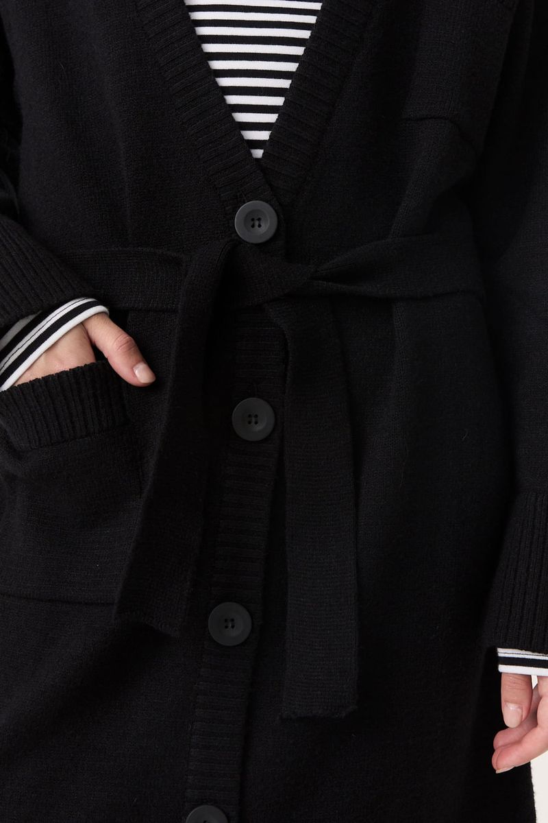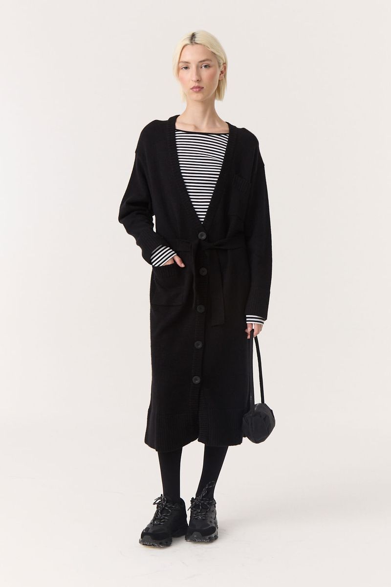 Cárdigan largo de hilado suave y esponjoso, de peso intermedio. Tiene un escote en V profundo y las mangas son ligeramente amplias. El calce de hombros y sisa es amplio y es largo hasta la primer cadera. Acceso por medio de botones. Este sweater es una prenda delicada, para que lo puedas conservar mucho tiempo te recomendamos lavarlo a mano de lado del revés./ Altura modelo: m / Talle: S/ Composición: 50% Rayón 27%Poliéster 23% Nylon / Origen: Importado