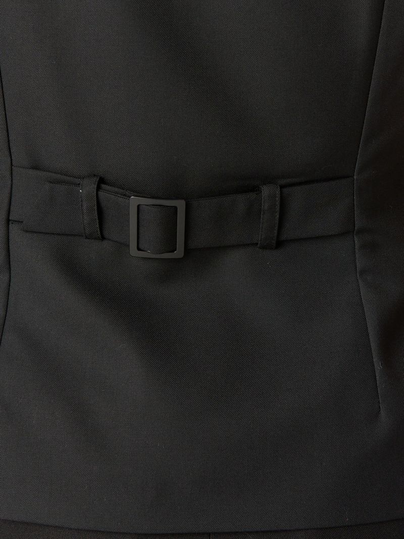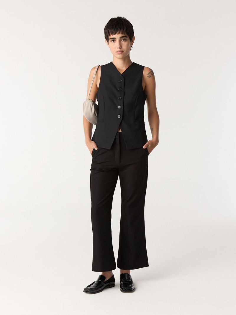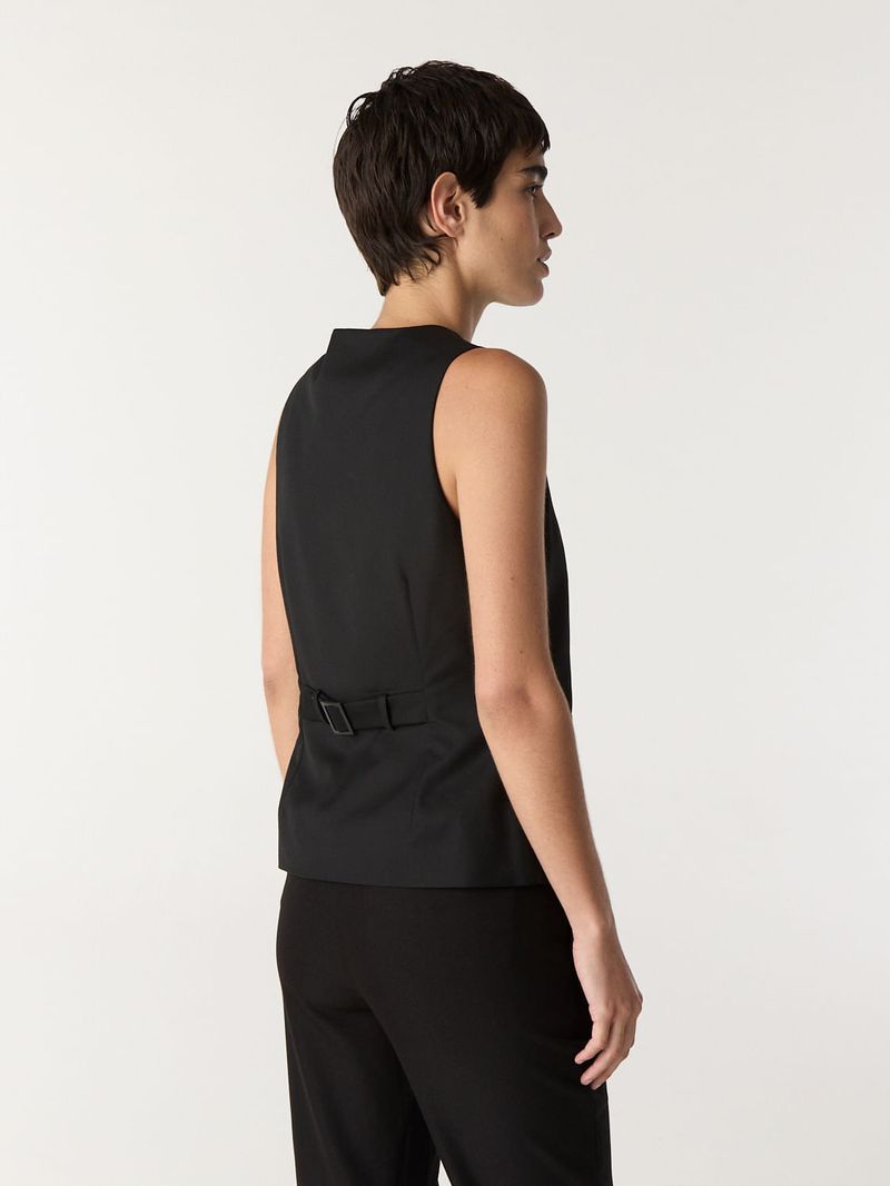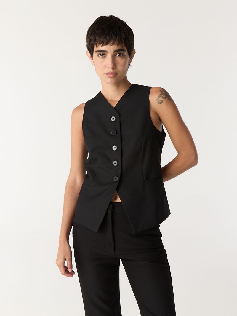Chaleco confeccionado en tela sastrera con escote en v y bolsillos ojales en delantero. Tiene acceso mediante botones grabados y detalle de martingala regulable en espalda para poder ajustar la cintura. Podes combinarlo con la Pollera Sastrera Asimetrica o el Pantalon Pinzado Sastre. • Altura modelo: Talle: S • Composición: 80% Poliester 18% Viscosa 2% Elastano / Forreria 100% Algodon • Origen: Importado