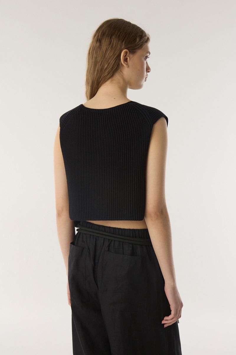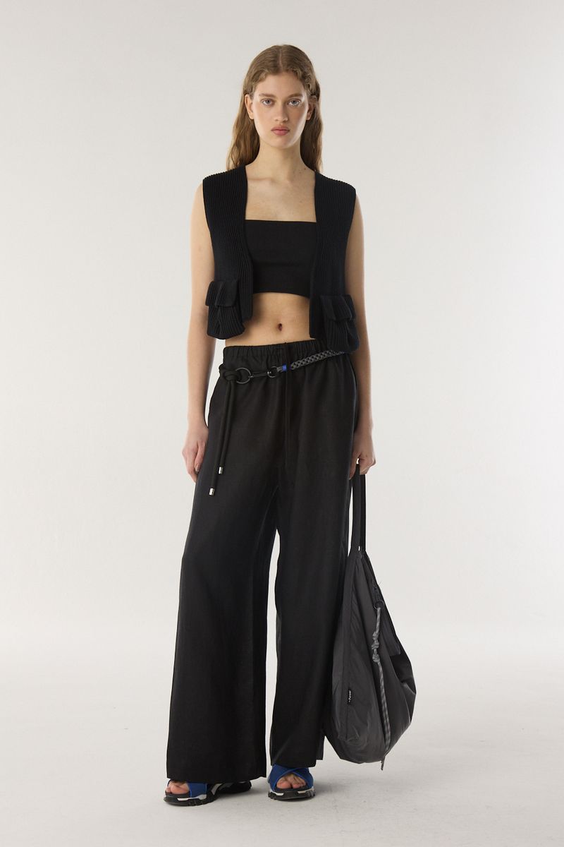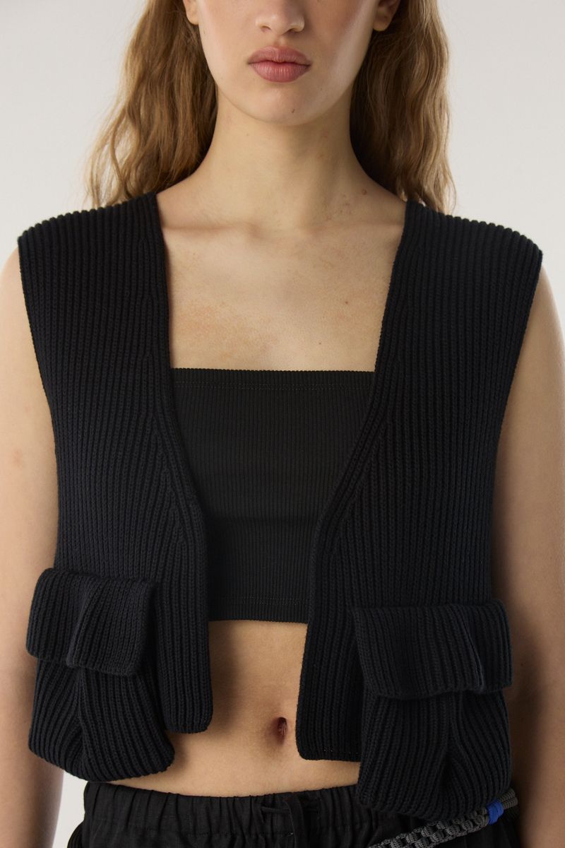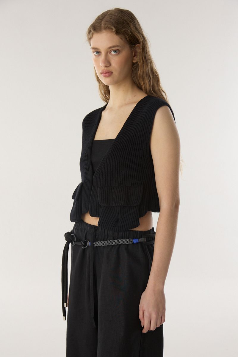 Chaleco estilo cardigan con hilado esponjoso, escote en v y bolsillos en el frente. • Altura modelo: 1,79 m Talle: S • Composición: 100% algodon • Origen: Nacional