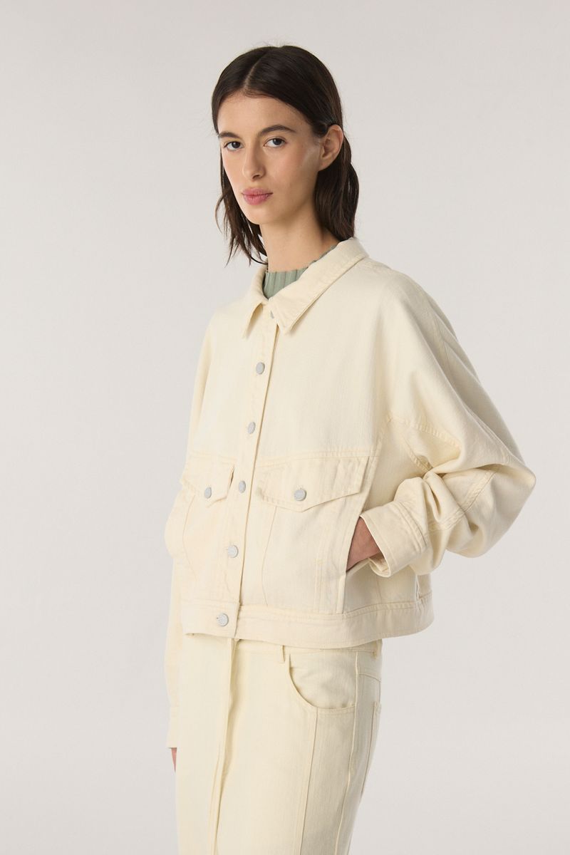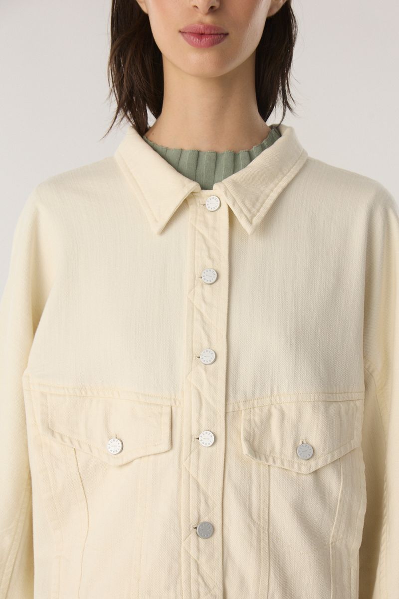 Chaqueta de gabardina con fit oversize. Es larga a la cadera, con recortes y bolsillos frontales. Acceso mediante cartera con botones metálicos en delantero. Combinalo con el Pantalon Recortes Gabardina. • Altura modelo: Talle: S • Composición: 72% Algodon 28% Viscosa / Relleno 100% Poliester • Origen: Importado