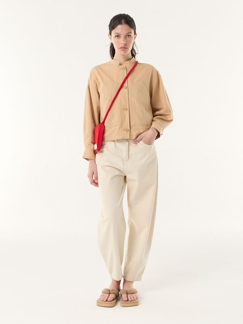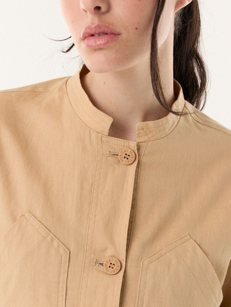 Chaqueta de lino con bolsillos grandes, cuellop mao y hombros caidos. Tiene mangas largas con puños tipo camiseros con boton y el acceso es por medio de botones a tono y grabados con logo. El calce es amplio con largo hasta la cadera. / Altura modelo: 1,75 m / Talle: S / Composición: 55% Algodón 45% Lino / Origen: Importado
