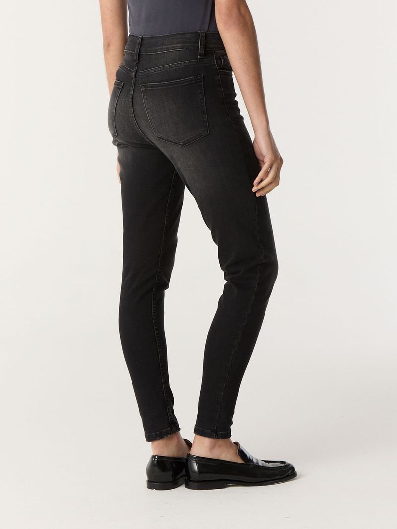 Jean de tejido suave de peso intermedio, elastizado. El calce es al cuerpo, tiro alto por debajo del ombligo. Tiene cinco bolsillos y detalle de badana en cintura de espalda. Largo hasta los tobillos / Altura modelo: 1,75m / Talle: 24 / Composición: 98%Algodon 2%Elastano / Origen: