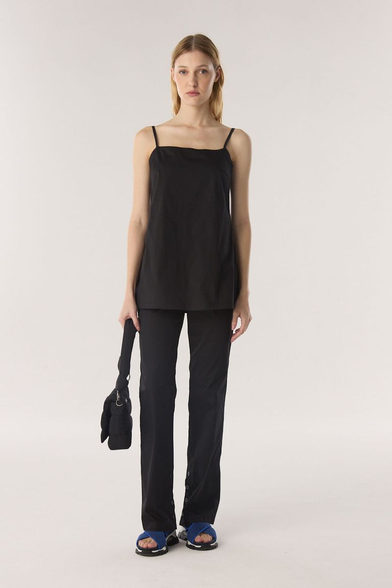 Enterito de tejido tech de tacto papeloso con cierre invisible en la espalda. Con detalle de botones grabados en botamangas. Con breteles y calce de pierna recto. / Altura modelo: 1,74 m Talle: S / Composición: 60% Algodón 32% poliamida 5% tencel 3% elastano / Origen: Importado