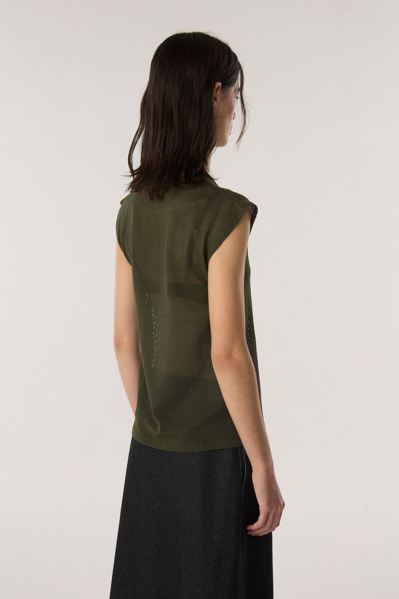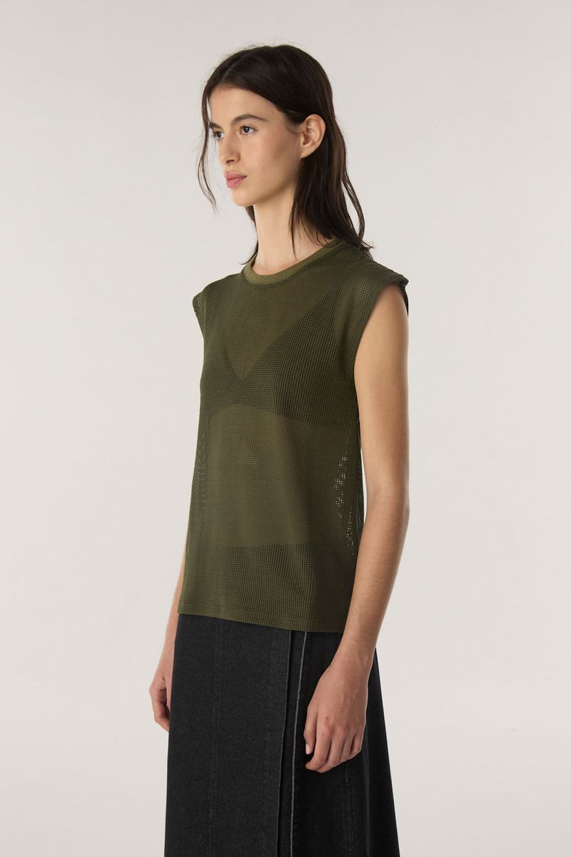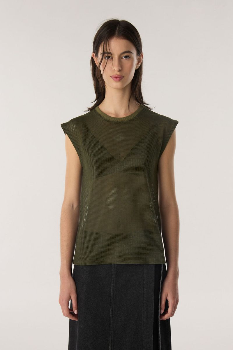 Remera de tejido de red con escote redondo y sin mangas. Calce regular en hombros y sisa. Largo hasta la primer cadera. / Altura modelo: 1,77 m Talle: S / Composición: 98% poliester 2% elastano / Origen: Importado
