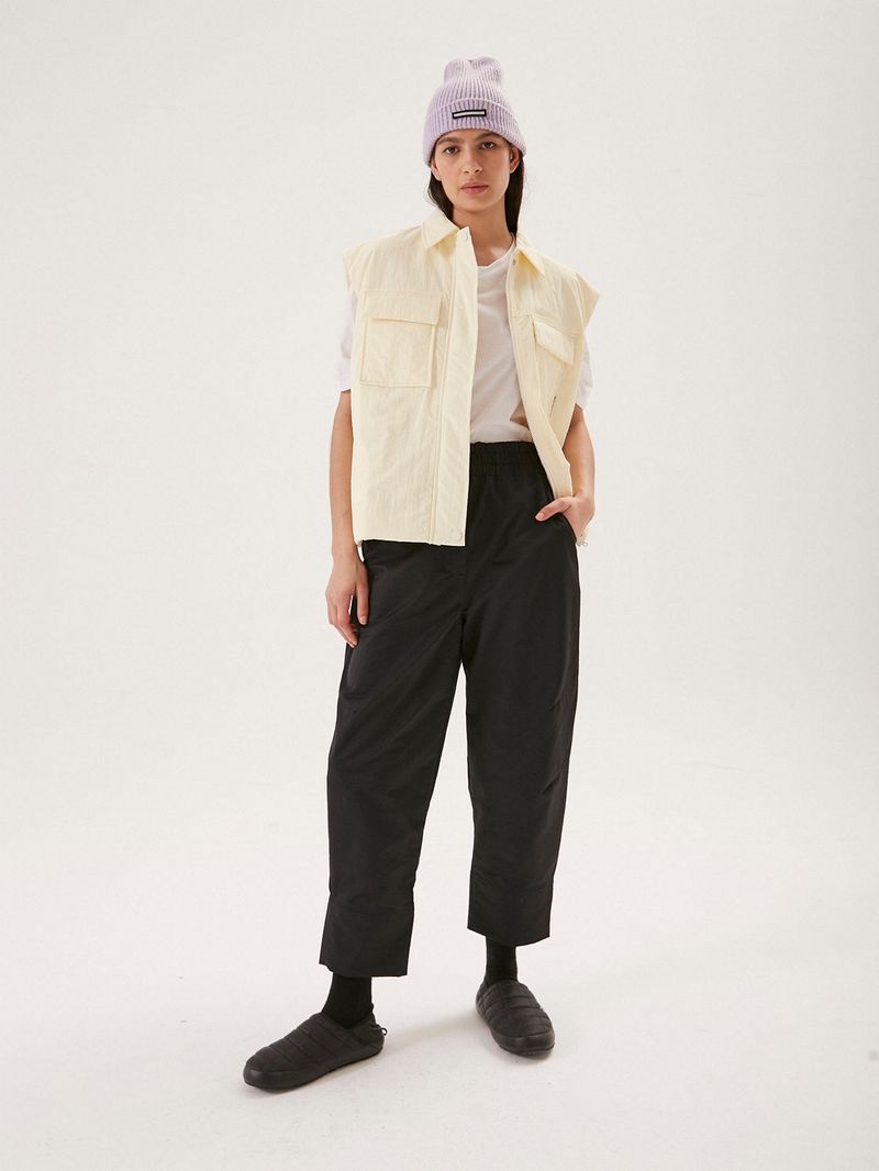 Pantalón de tejido plano con lustre. Tiene cintura alta con frunces y elástico interno, y dos bolsillos laterales con pinzas decorativas. El calce de pierna es bombé con pinzas en la rodilla. Tiene dos bolsillos ojal en la espalda y un recorte en el bajo a modo de botamanga. Es largo hasta los tobillos. • Altura modelo: 1,78 m Talle: S • Composición: 100% algodón • Origen Nacional