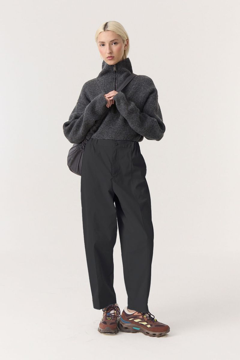 Pantalón recto amplio con recortes delanteros. Tiene 2 bolsillos en delantero y elástico en cintura. Acceso por medio de cierre y botón con detalle de marca. / Altura modelo: 1