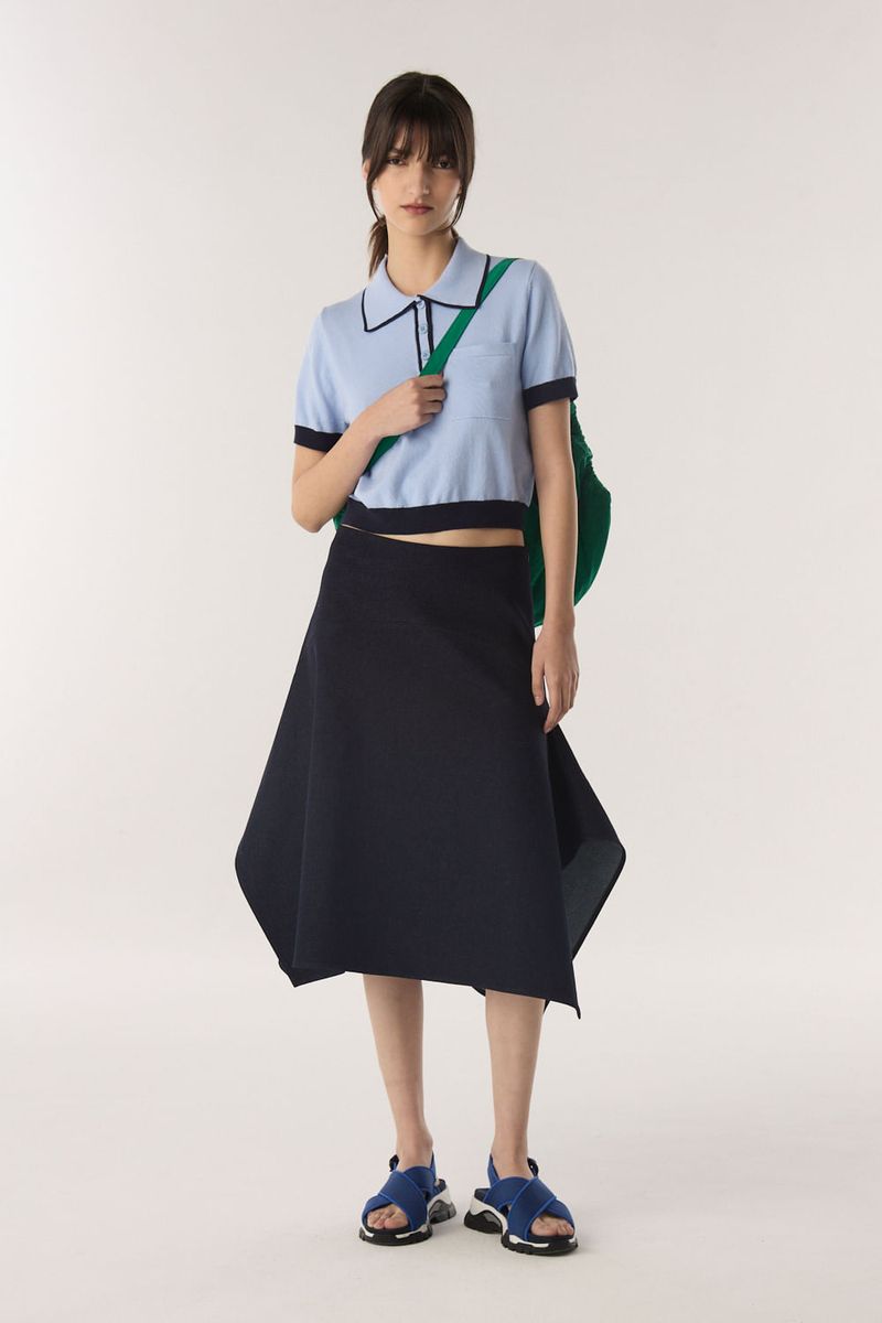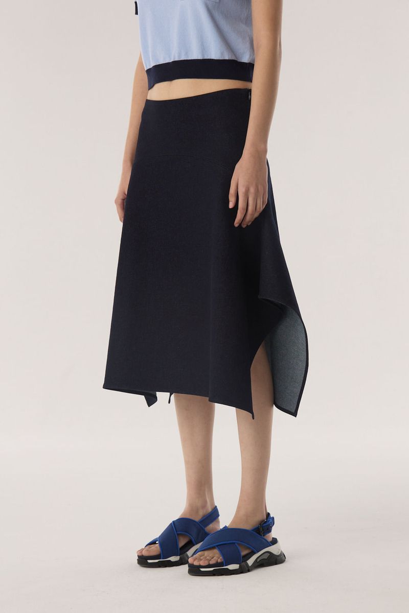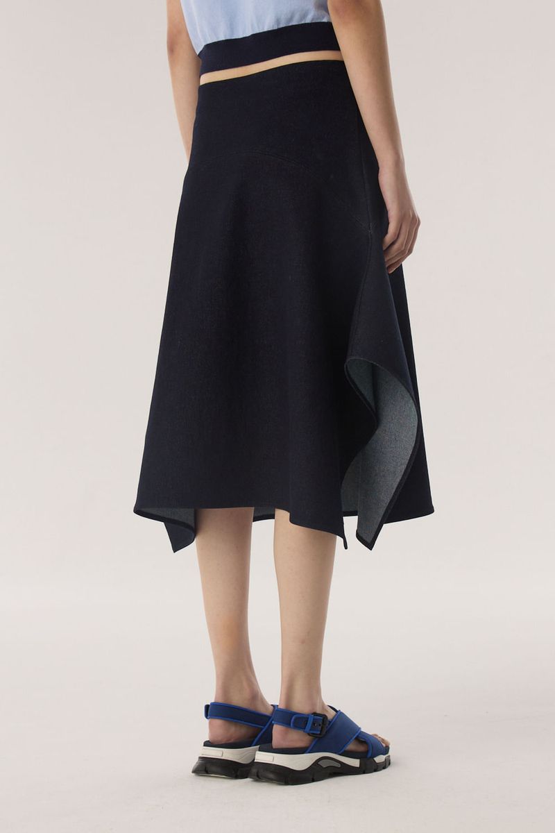Pollera larga de denim con recortes que generan vuelo en la prenda. El acceso es mediante un cierre oculto en espalda. Combinalo con la Campera Jean Vuelo para generar un total look. / Altura modelo: 1.77 m / Talle: S / Composición: 98% algodon 2% elastano / Origen: Importado