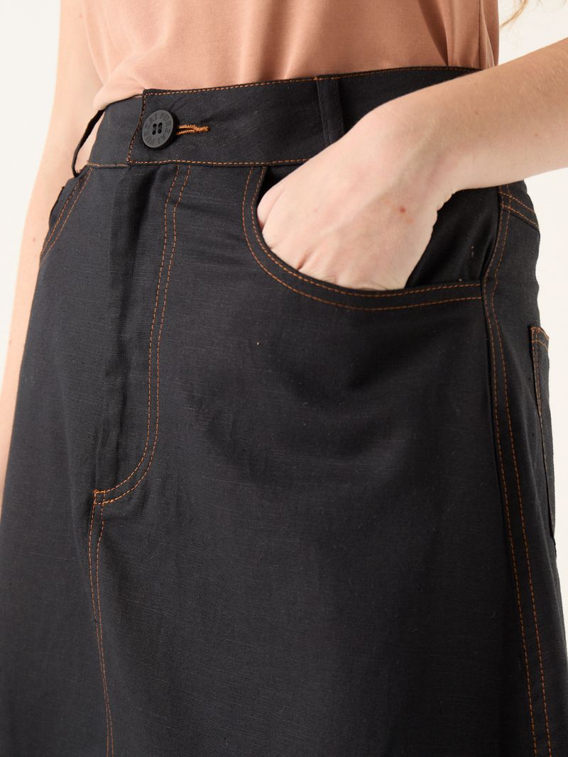 Pollera larga de lino con costuras jeaneras a contratono. Lleva recorte que genera vuelo en la caída de la prenda. / Altura modelo: 1.75 m / Talle: S/ Composición: 55% Algodón 45% Lino / Origen: Importada