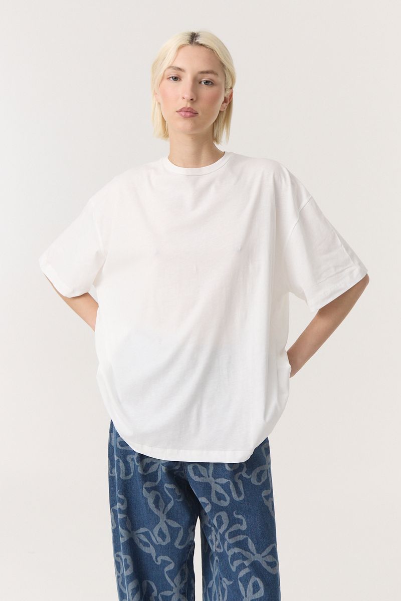 Remerón manga corta de jersey pima. Calce oversized, sisa y manga amplias. Largo hasta bajo la cadera / Altura modelo: 1,78 m Talle: S / Composición: 100% Algodón / Origen: Nacional