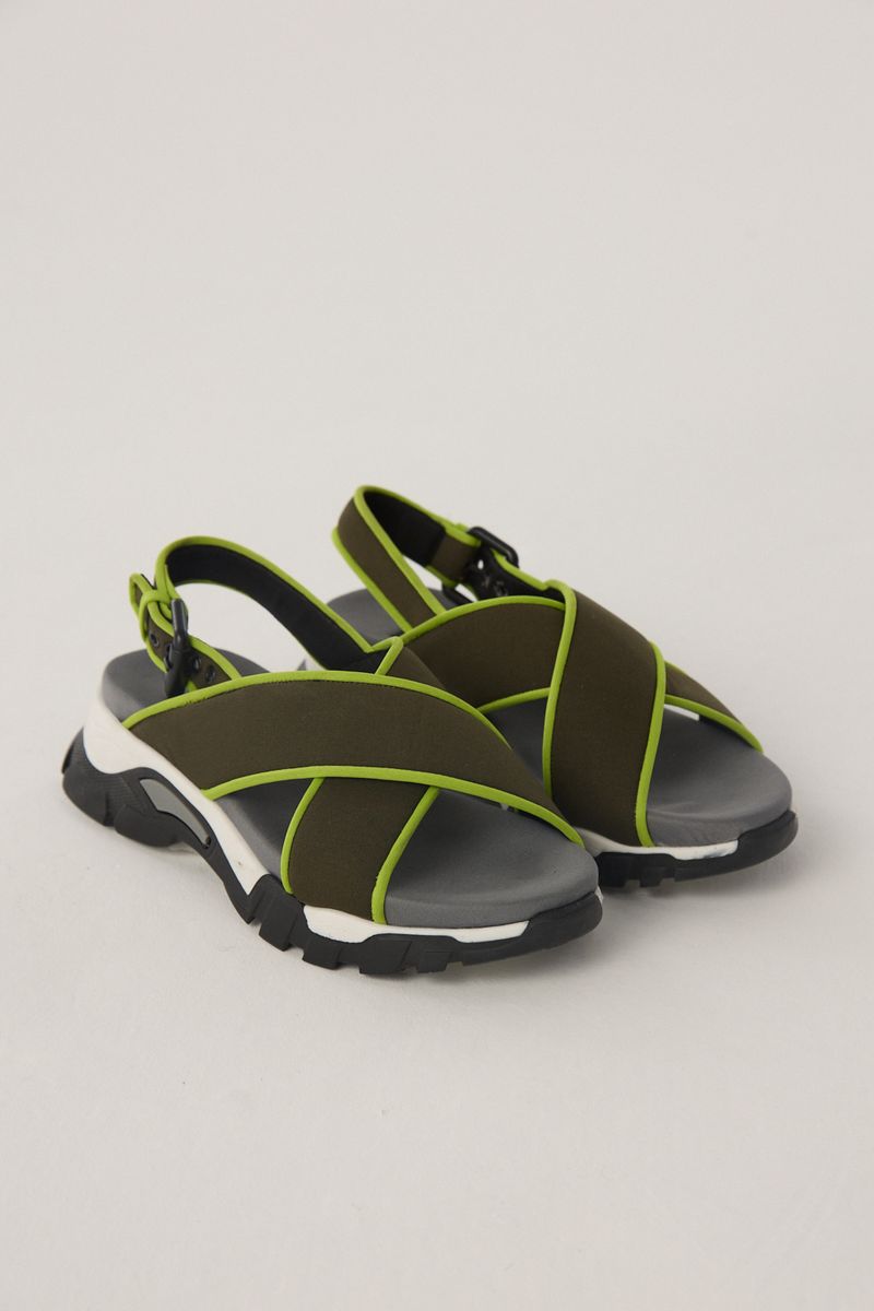 Sandalias de tiras anchas de tela bondeada con vivos a contratono. Acceso en talón a través de hebilla y ojalillos. Origen: Nacional.
