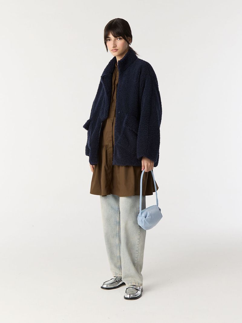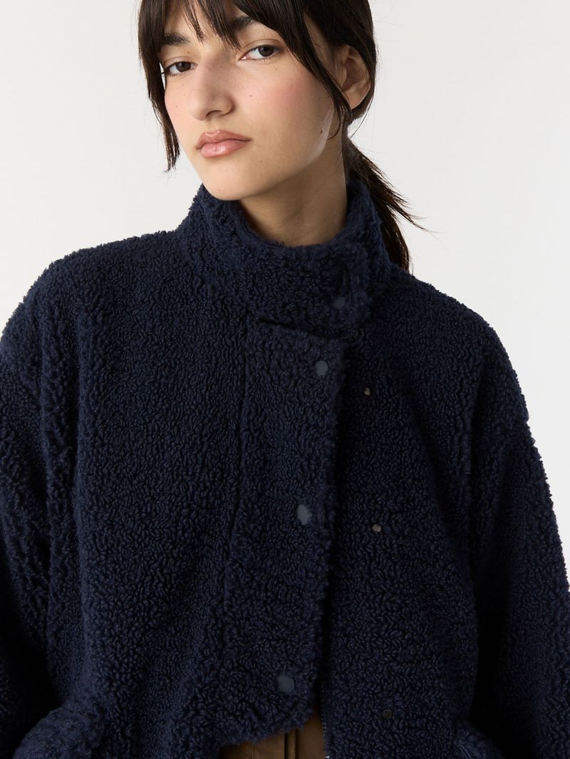 Campera de tejido sherpa con cuello alto. Tiene bolsillos delanteros y acceso mediante botones snaps y cierre oculto. El calce es recto over con largo hasta la segunda cadera y manga larga. / Altura modelo: 1,77 m Talle: S / Composición: 100% Poliéster / Origen: Importado