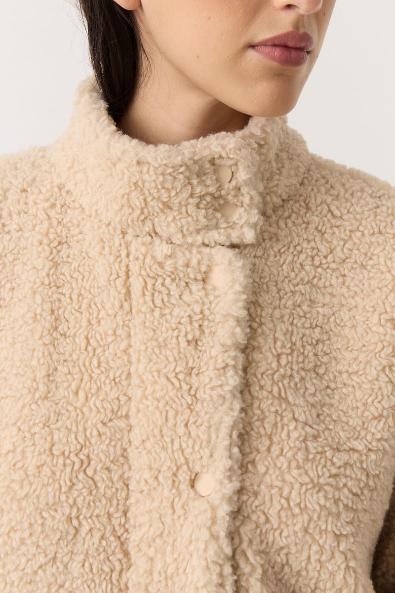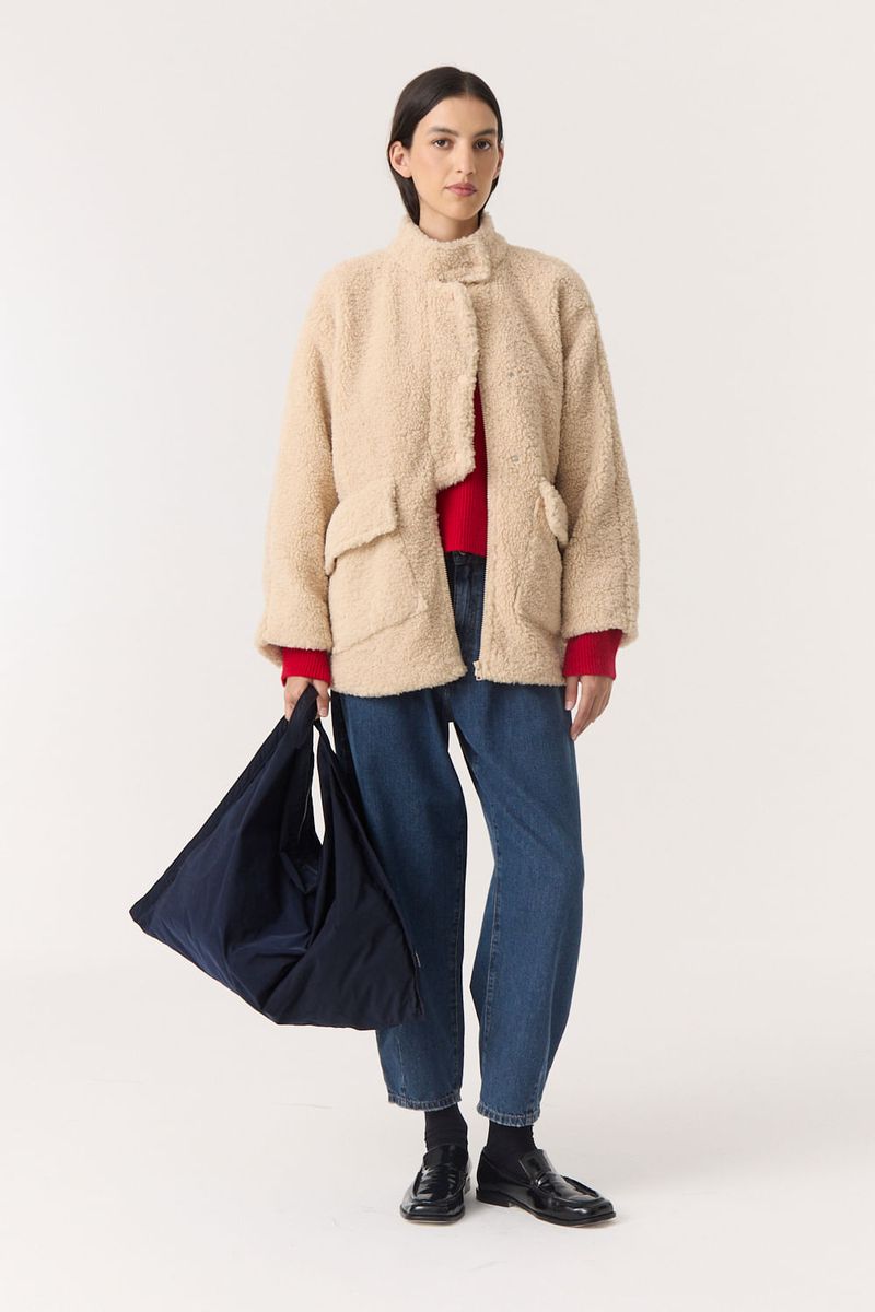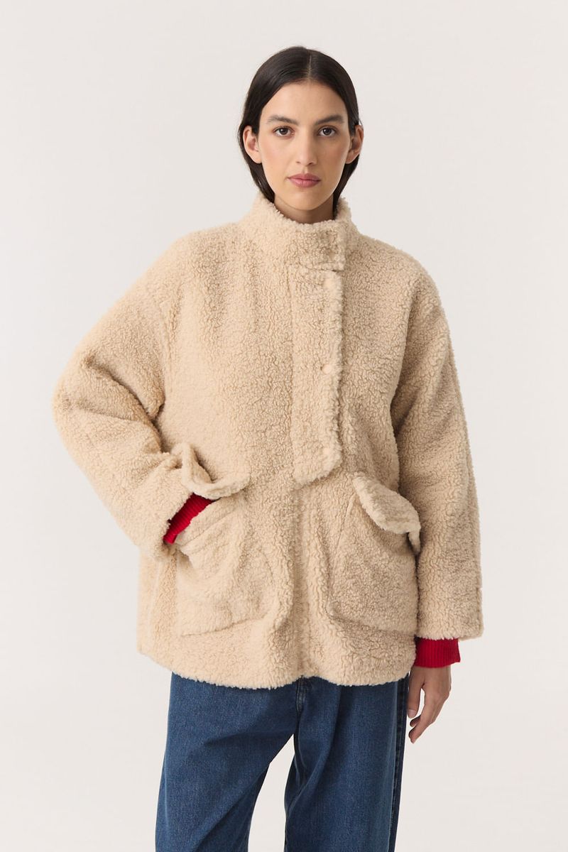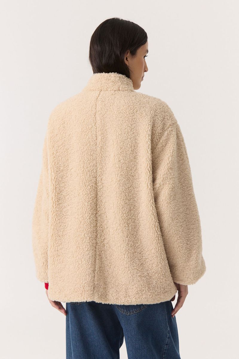 Campera de tejido sherpa con cuello alto. Tiene bolsillos delanteros y acceso mediante botones snaps y cierre oculto. El calce es recto over con largo hasta la segunda cadera y manga larga. / Altura modelo: 1,77 m Talle: S / Composición: 100% Poliéster / Origen: Importado