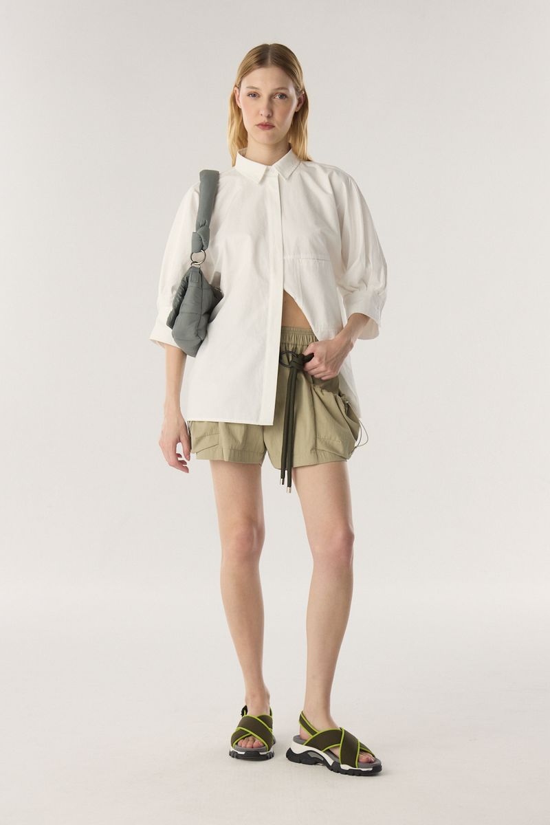 Bermuda con elastico en cintura. El calce es suelto en piernas, dos bolsillos laterales con elastico y tanca para ajustar. Largo por arriba de la rodilla. / Altura modelo: 1,74 m / Talle: S / Composición: 70% algodón 30% poliamida / Origen: Importado
