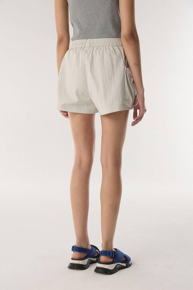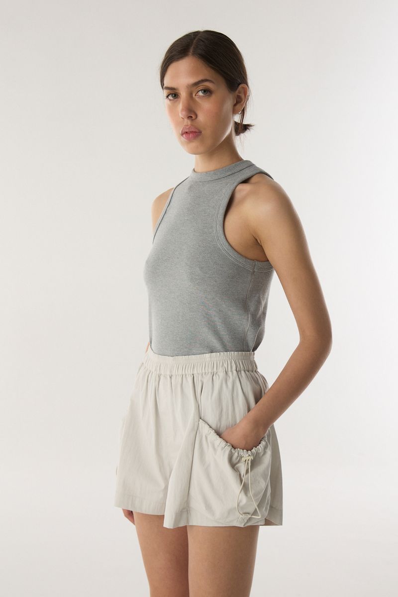 Bermuda con elastico en cintura. El calce es suelto en piernas, dos bolsillos laterales con elastico y tanca para ajustar. Largo por arriba de la rodilla. / Altura modelo: 1,74 m / Talle: S / Composición: 70% algodón 30% poliamida / Origen: Importado