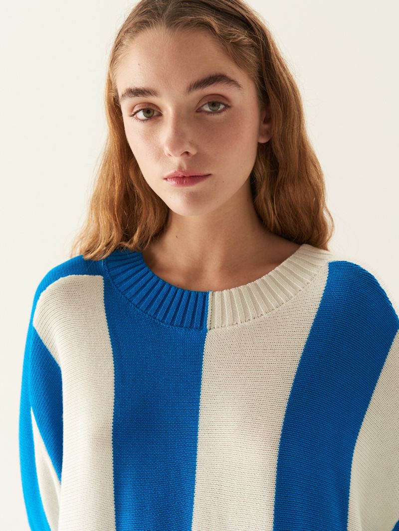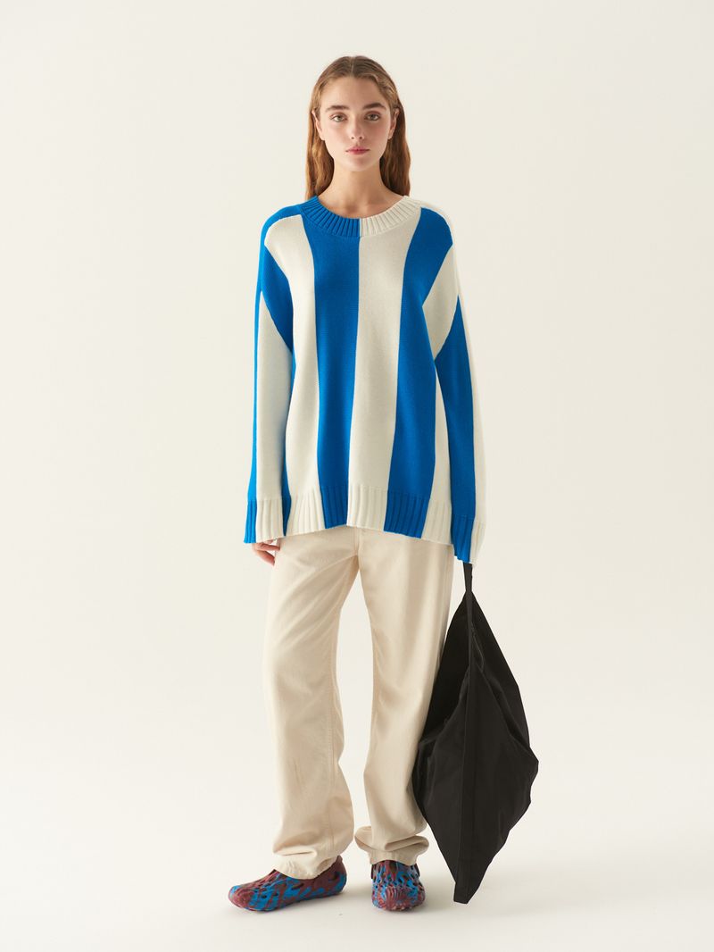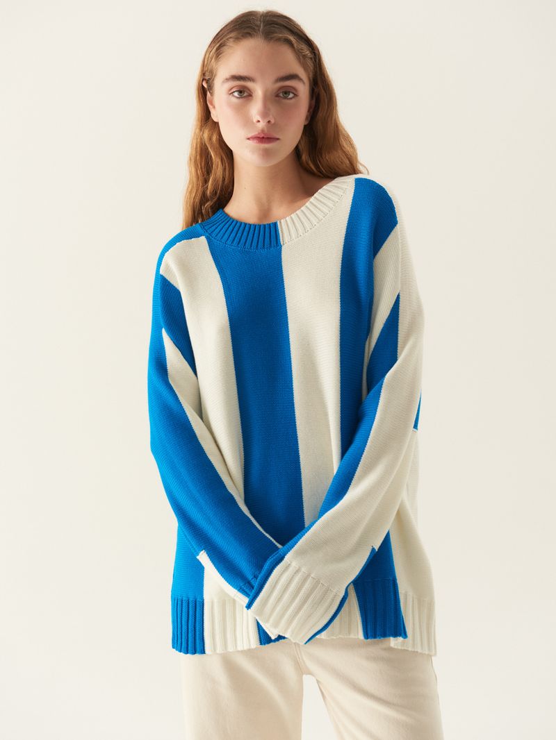 Sweater de hilado de algodón mezcla con bloques verticales y terminaciones tejidas en rib. Tiene escote redondo levemente amplio y mangas largas. El calce es amplio y es largo hasta la segunda cadera. / Altura modelo: 1,76 m / Talle: S/ Composición: 55% Acrílico 45% Algodón/ Origen: Importado