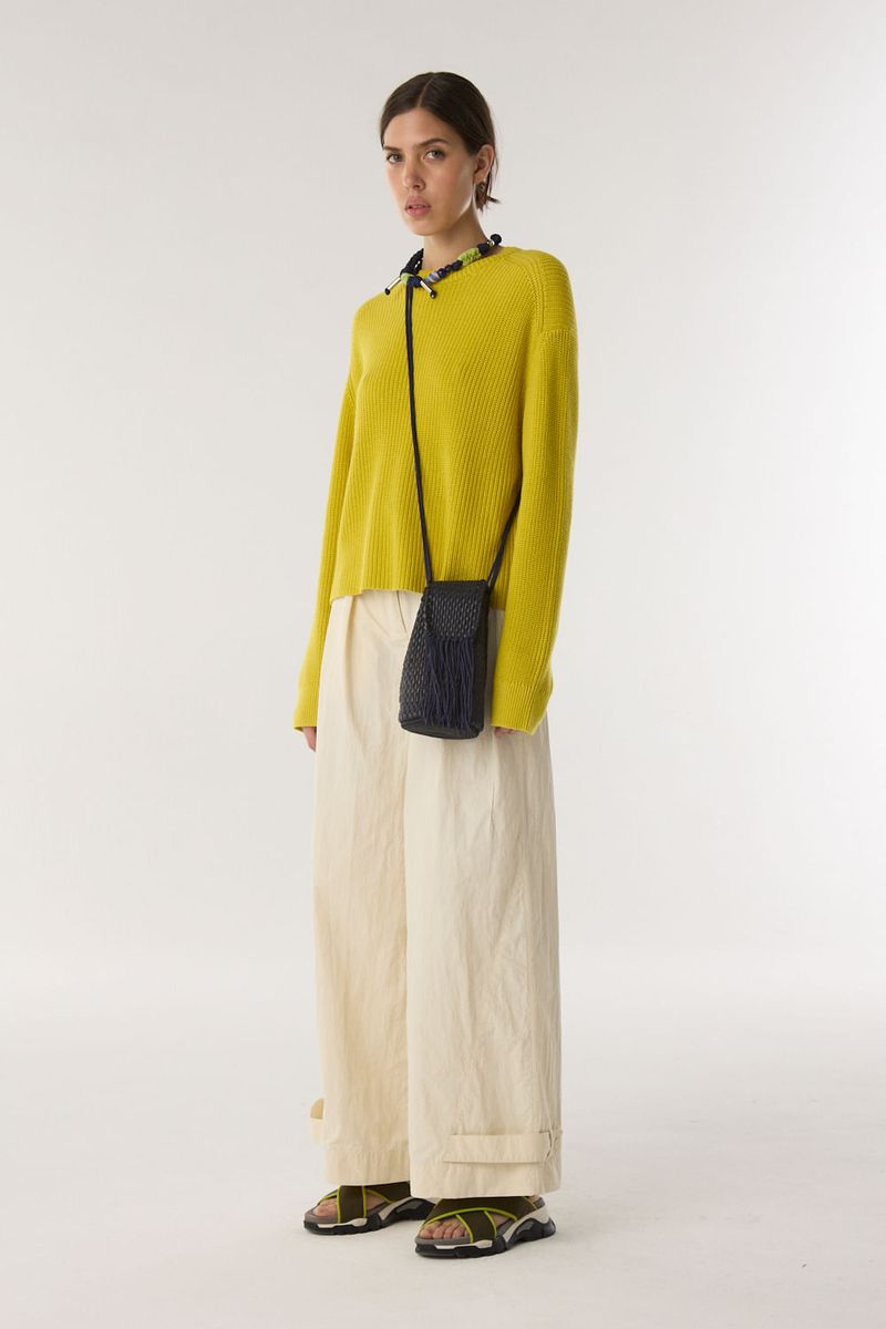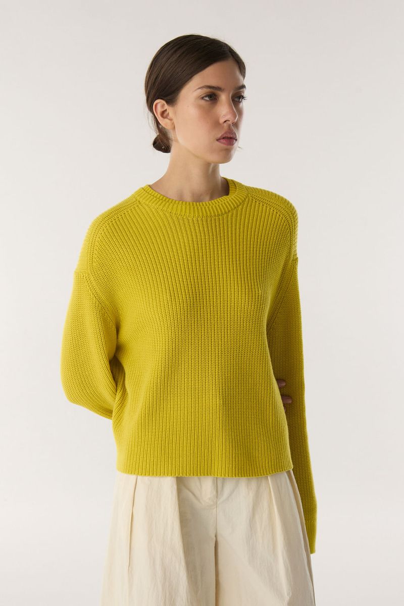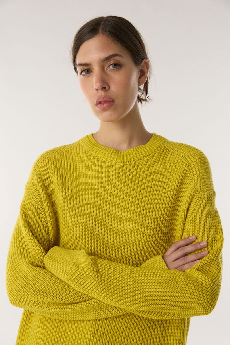 Sweater de hilado de algodón mezcla, de peso intermedio. Tiene un escote redondo y el calce es amplio. Es largo hasta la primera cadera. Este sweater es una prenda delicada, para que lo puedas conservar mucho tiempo te recomendamos lavarlo a mano de lado del revés. / Altura modelo: 1,77 m Talle: S / Composición: 55% Acrílico 45% Algodón / Origen: Importado