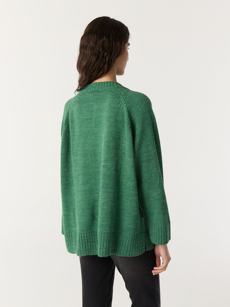 Sweater de hilado suave y esponjoso, de peso intermedio. Tiene un cuello redondo levemente escotado hacia los hombros, mangas amplias y tajos laterales. El calce es relajado y es largo hasta la segunda cadera. Este sweater es una prenda delicada, para que lo puedas conservar mucho tiempo te recomendamos lavarlo a mano de lado del revés. / Altura modelo: m Talle: S / Composición: 85% Acrilico 15% Poliamida / Origen: Nacional
