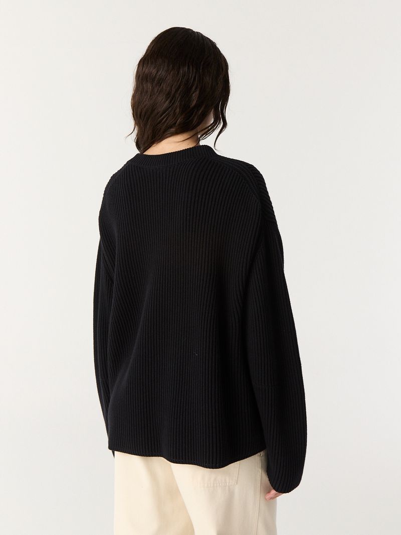 Sweater de hilado de algodón de peso pesado, de punto canelado. El cuello es redondo a la base y tiene un detalle de cambio de dirección de tejido. Tiene pinzas en el interior de las mangas que generan una silueta bombé, el calce del cuerpo es recto y amplio. / Altura modelo: 1,70 m Talle: S / Composición: 100% Algodón / Origen: Nacional