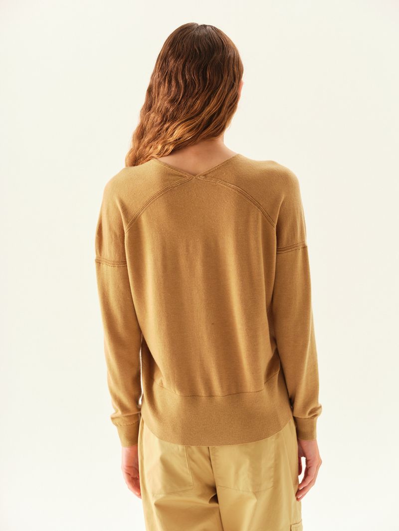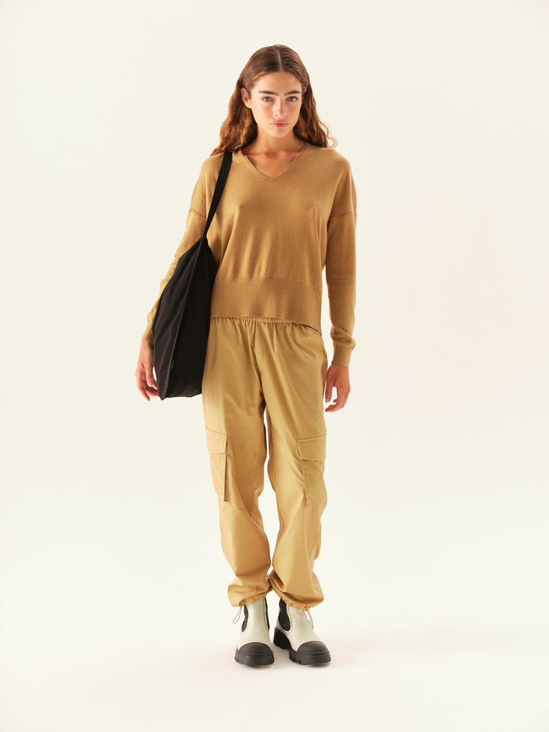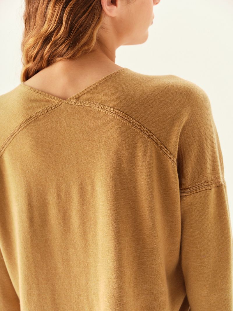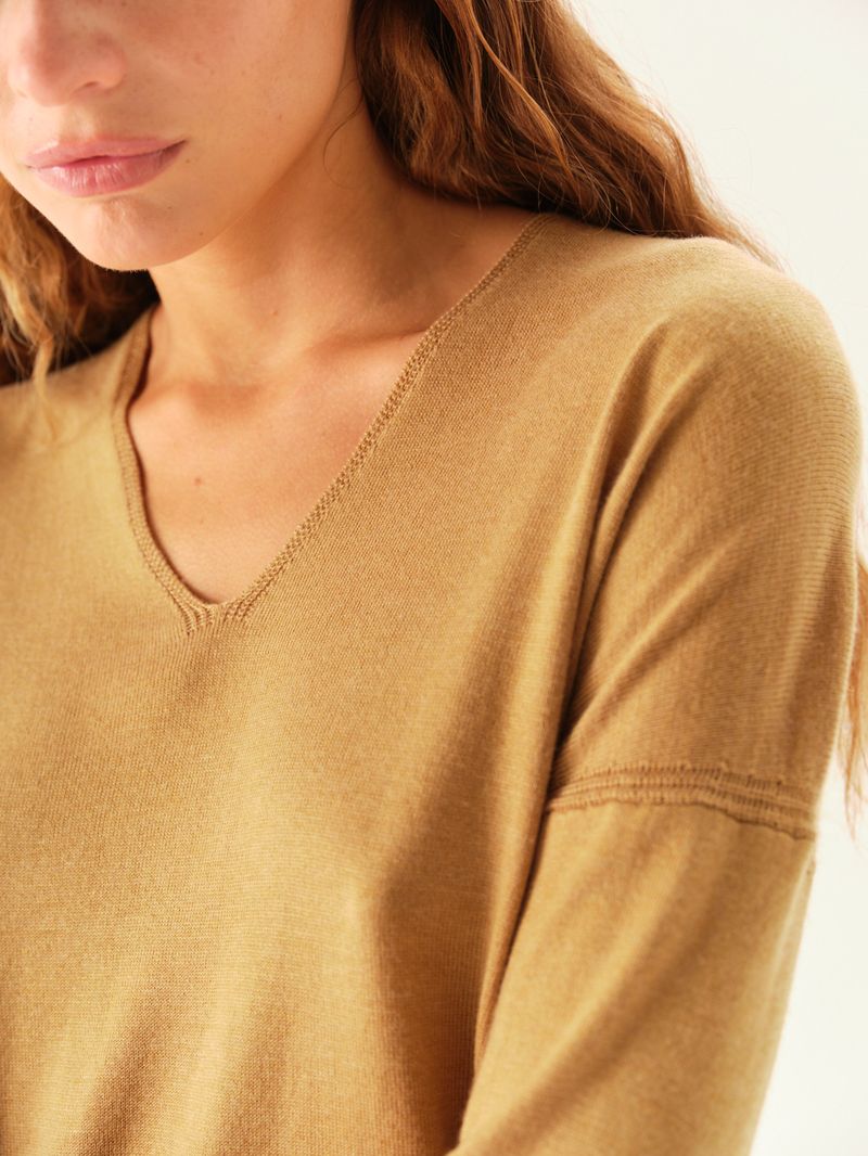 Sweater de hilado sustentable con cuello en V. Calce amplio y puños ajustados en bajo y mangas. / Altura modelo: 1,70 m Talle: S / Composición: 50% Poliéster Reciclado 6% Lana 24% Acrilico Antipilling 20% Nylon / Origen: Importado