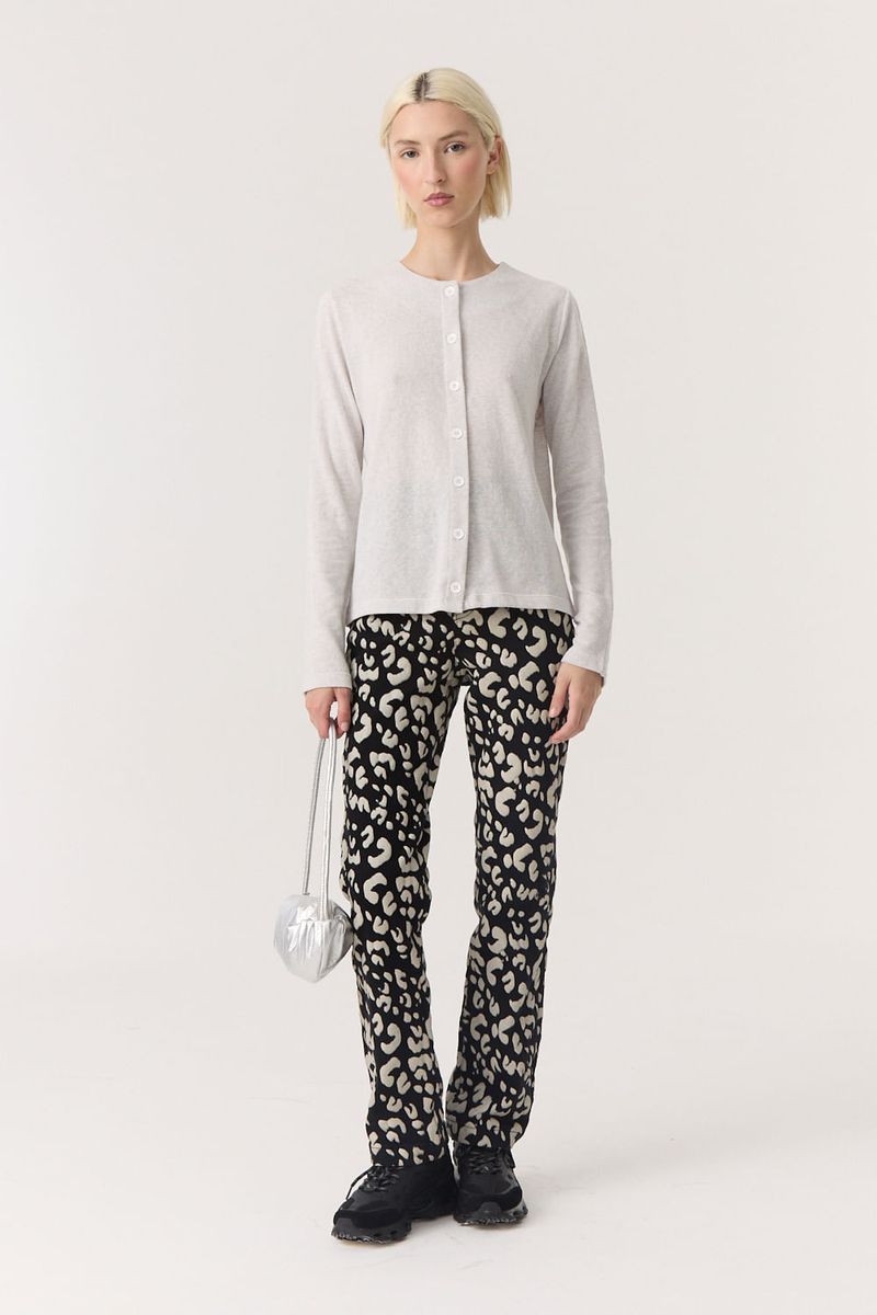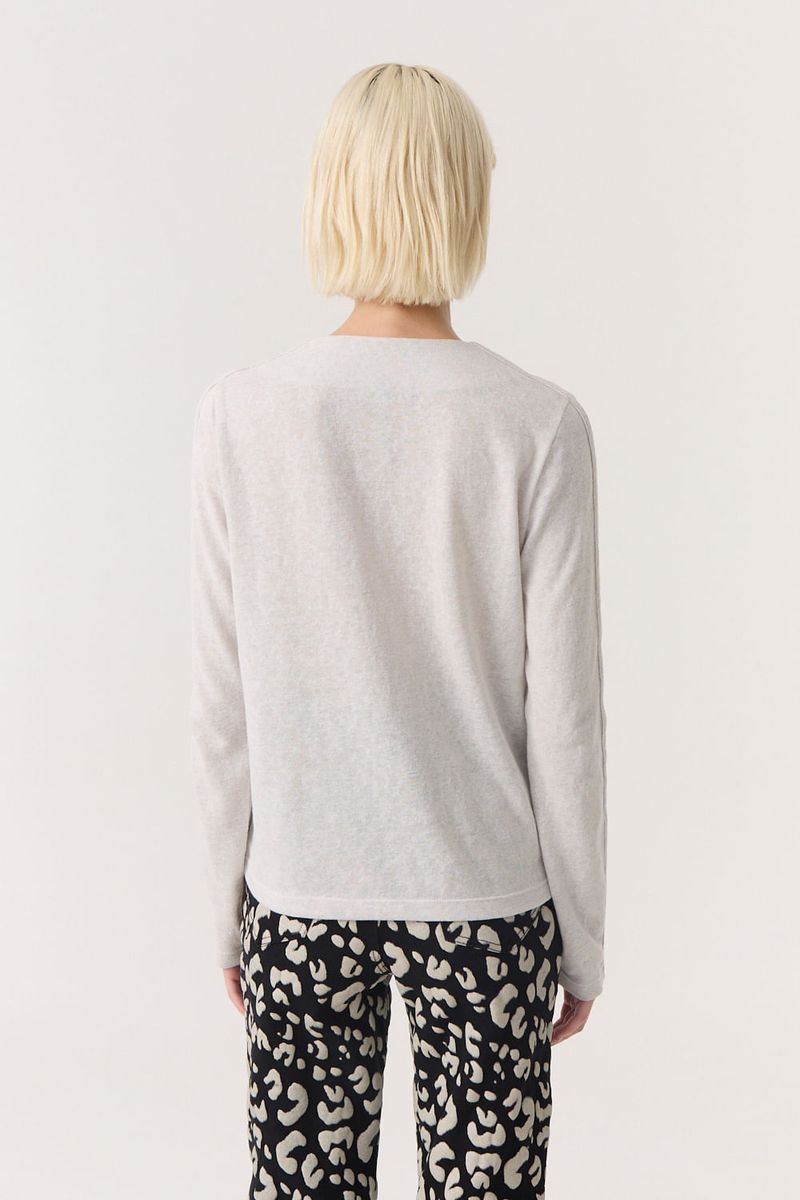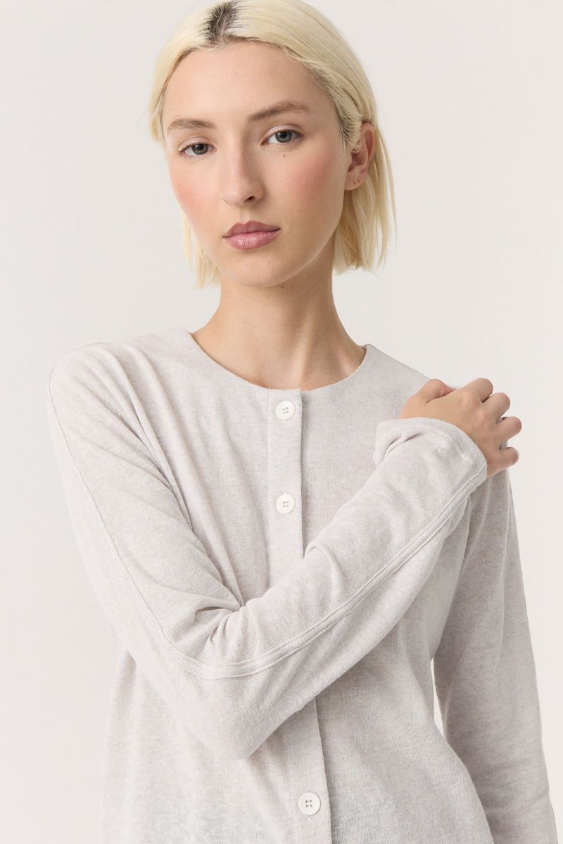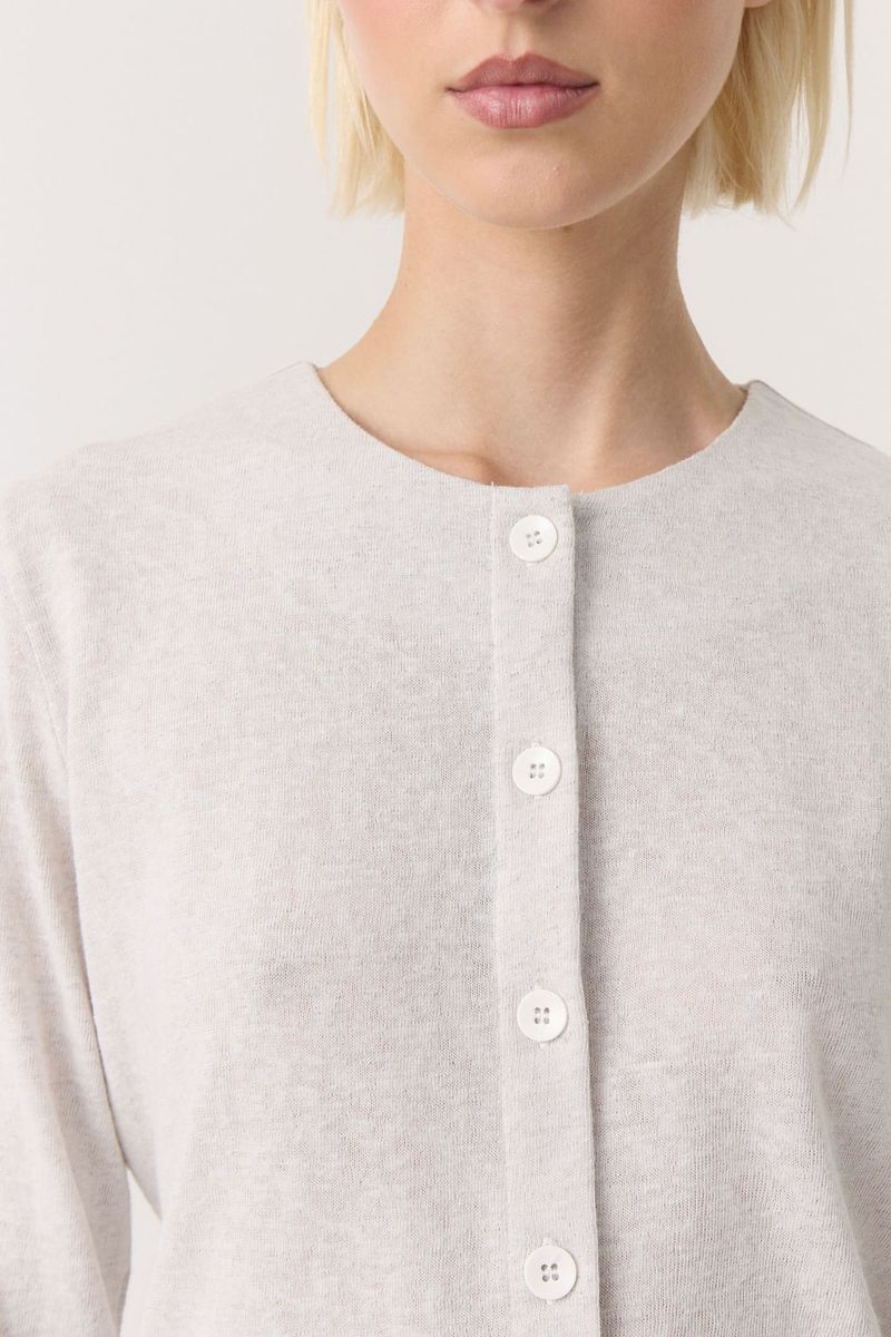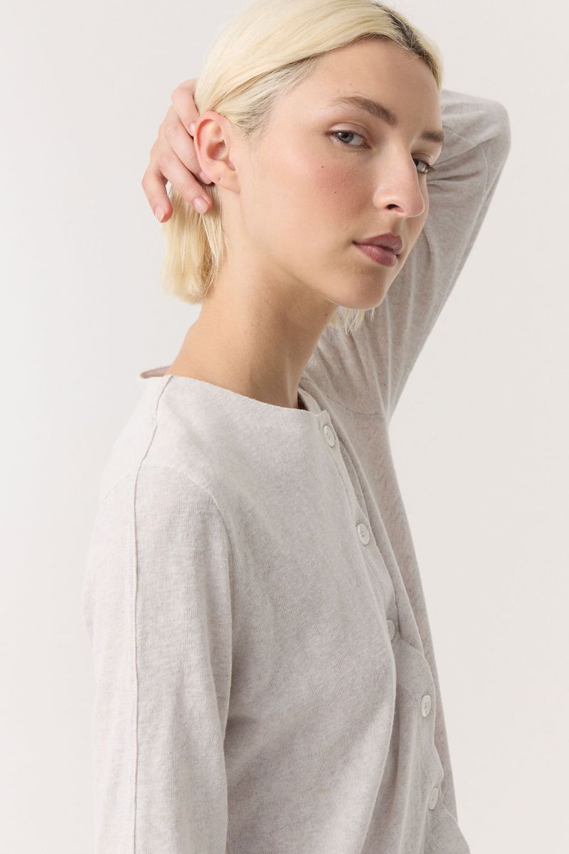 Top estilo cardigan de punto con escote redondo y acceso mediante botones de pasta a tono grabados. Calce al cuerpo y manga larga con detalle de vivo en tela base. Largo hasta la cadera. / Altura modelo: 1,67 m Talle: S / Composición: 62% Algodón 38% Poliéster / Origen: Nacional