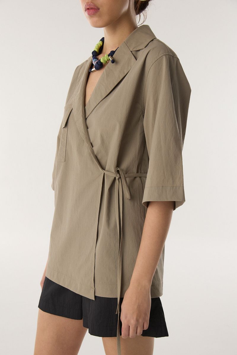 Camisa de tejido plano papeloso. El calce es regular con detalle de lazo para atar en cintura. Con bolsillo aplicado en delantero. /Altura modelo: 1,77 m Talle: S / Composición: 71% poliamida 27% algodón 2% elastano / Origen: Importado