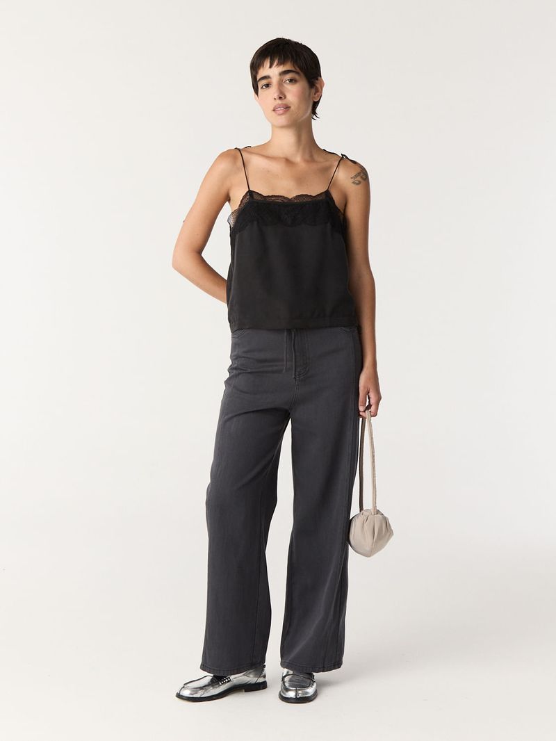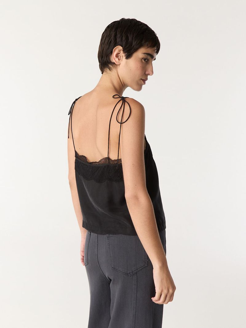 Top de tejido de cupro liviano con caida. Tiene calce recto con breteles spaguetti para atar regulables y detalle de encaje a en escote. • Altura modelo: Talle: S • Composición: 60% Cupro 40% Viscosa / encaje: 88% Poliamida 12% Elastano • Origen: Importado