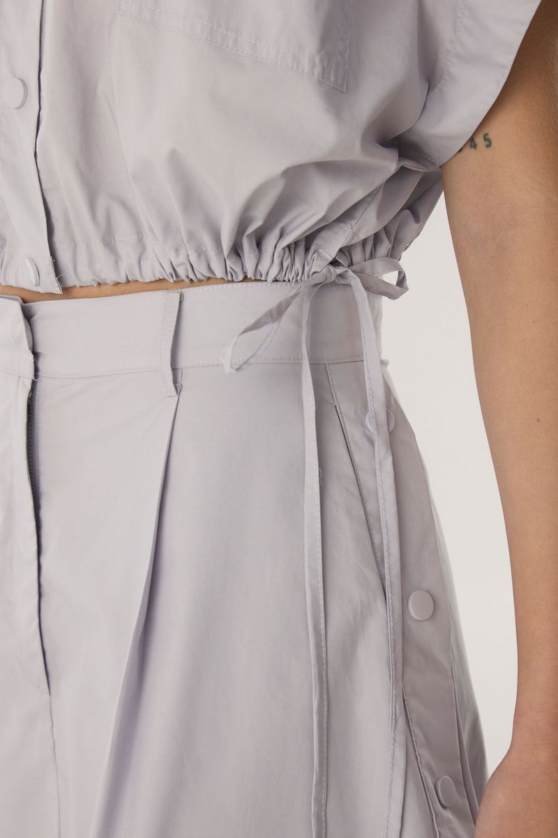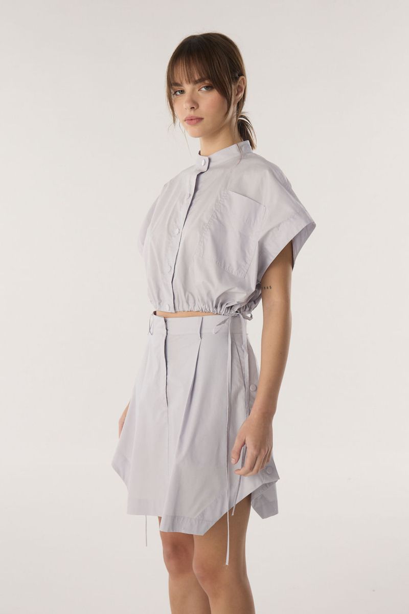 Top camisero corto de algodon con cuello mao y hombros amplios. Tiene un bolsillo en el frente y ruedo con jareta y tiras de ajuste. El acceso es por medio de cartera con botones snaps. El calce es recto y es largo hasta la cintura. Para un total look combinalo con la Mini Safari Poplin. / Altura modelo: 1,74 m Talle: S / Composición: 100% algodon / Origen: Importado