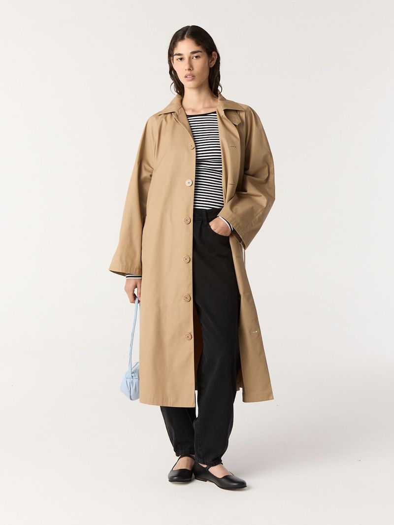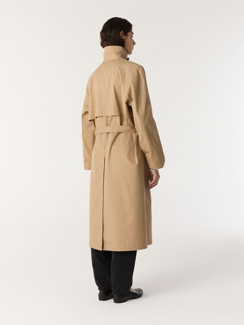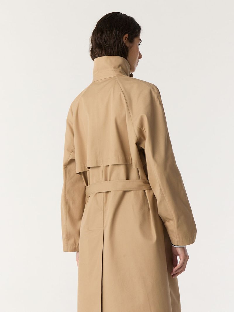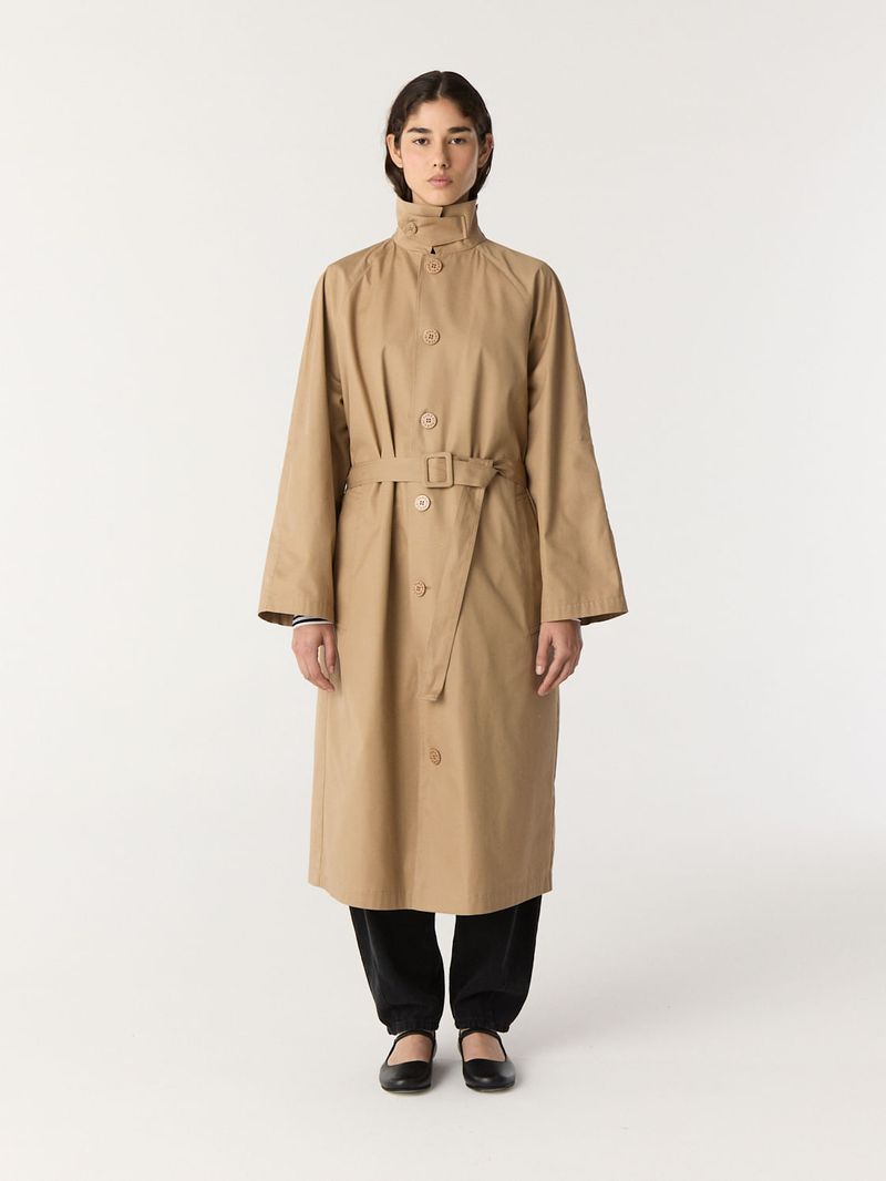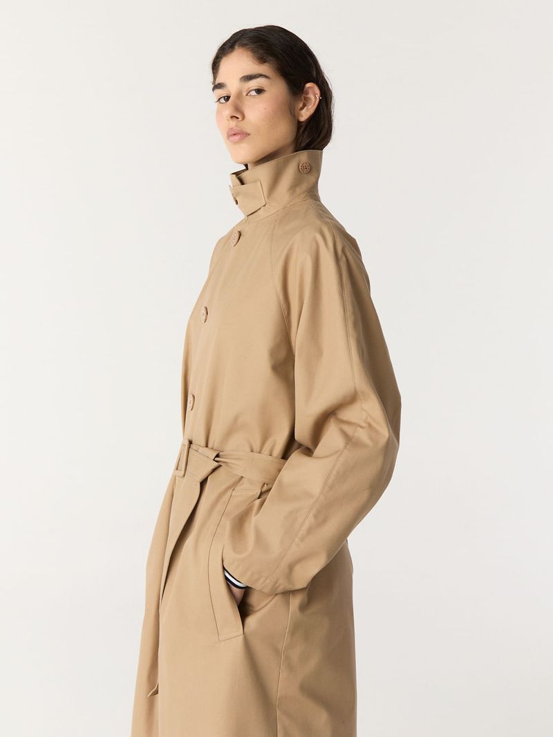 Abrigo tipo trench de gabardina pesada de algodón. Tiene mangas corte ranglan amplias, lazo en cintura y una presilla con botón en el cuello que permite usarlo levantado. Calce recto y largo 7/8. / Altura modelo: 1,76 m / Talle: S/ Composición: 100% Algodón / Origen: Importado
