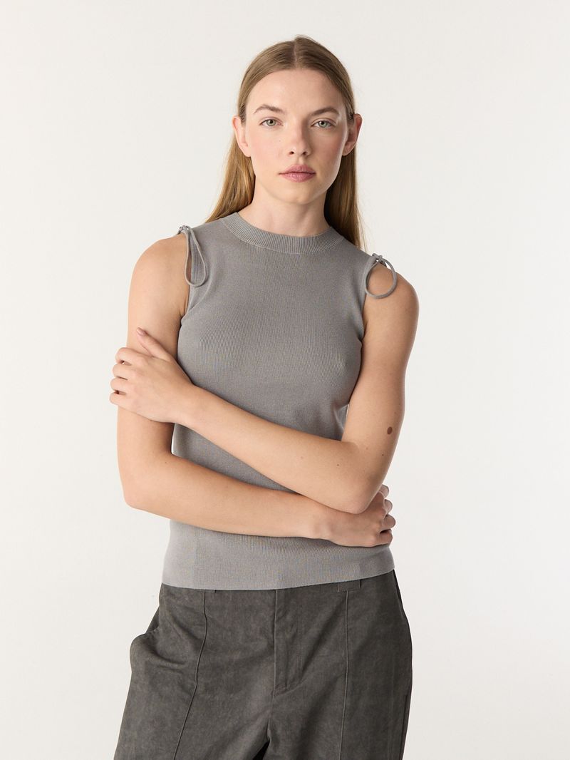 Set de chaleco y mangas tejido con hilo de viscosa. El chaleco tiene calce al cuerpo, largo hasta la primer cadera y cuello trepado. Las mangas tienen un detalle de tejido invertido en la espalda. Ambas partes se atan con un cordon tejido en hombros. • Altura modelo: m Talle: S • Composición: 100% Viscosa • Origen: Importado