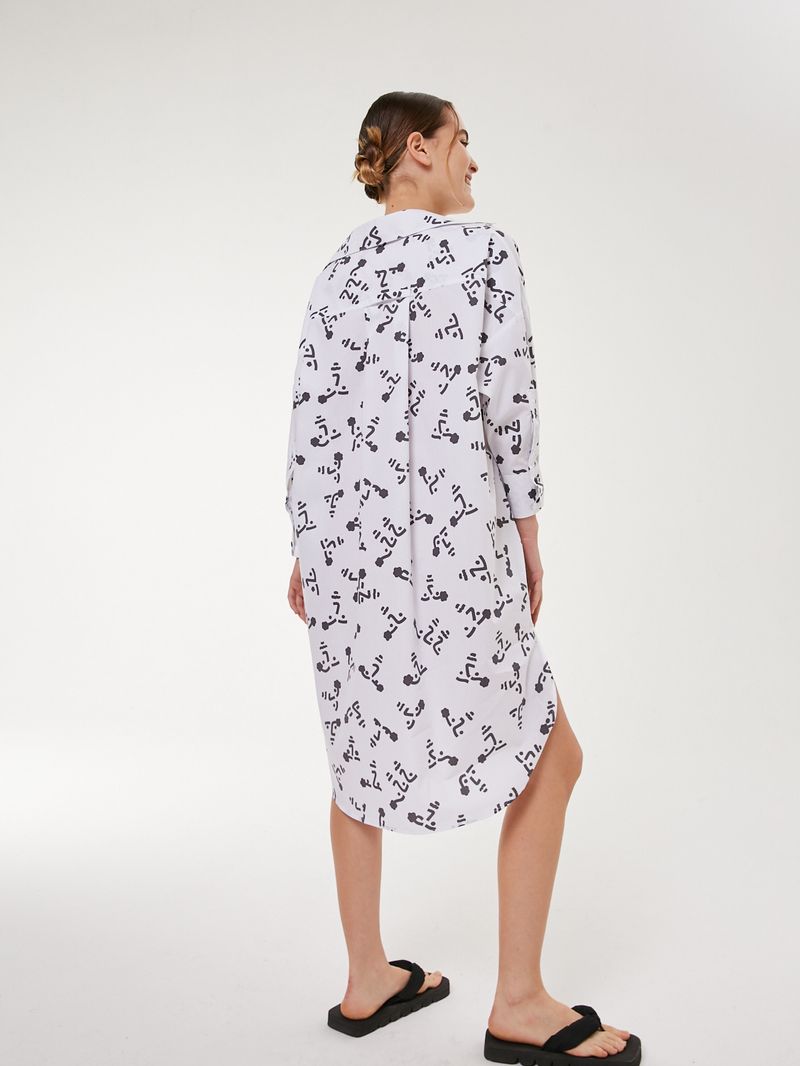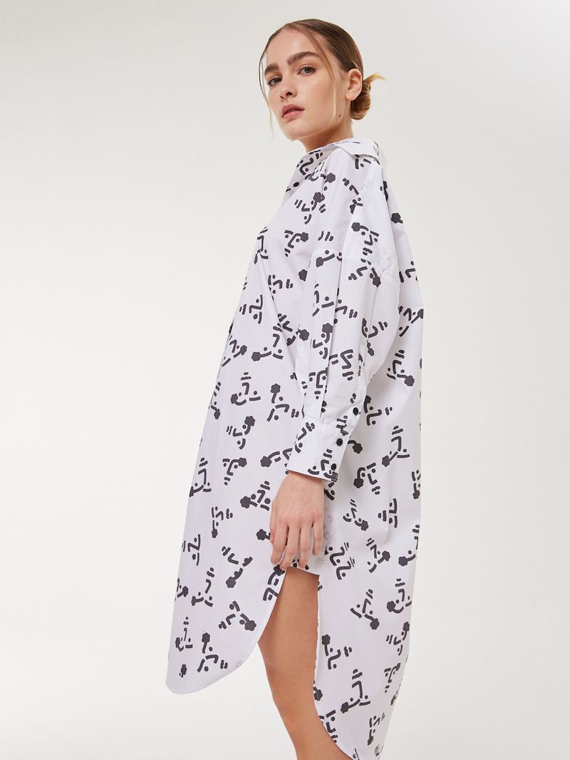 Camisa larga de poplin de algodón estampado. El calce es amplio, con sisa amplia y tabla cuadrada en espalda con presilla para colgar. Tiene tajos laterales con detalle de recorte rectangular, y es largo hasta la rodilla. / Altura modelo: 1,74 m / Talle: S/ Composición: 100% Algodón / Origen: Nacional