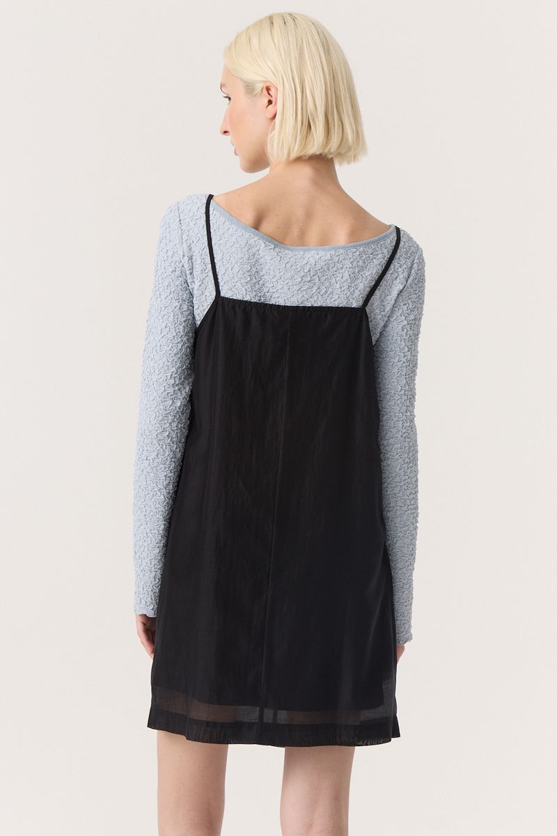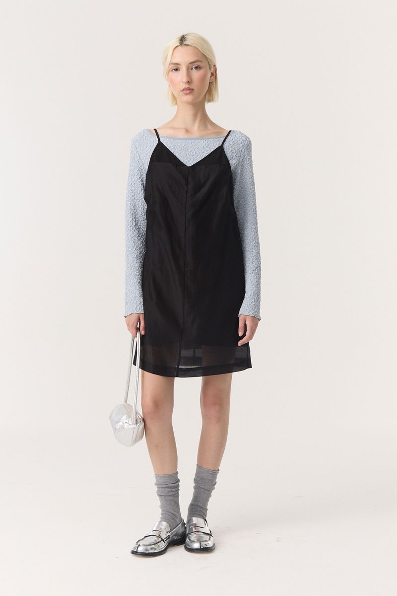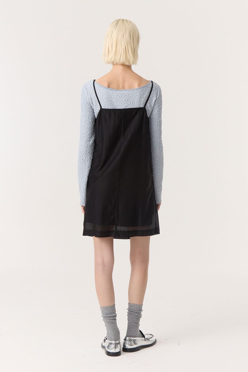 Vestido corto con superposicion de tela. Tiene breteles finos, doble escote, en V y recto, y espalda abierta. / Altura modelo: 1,75 m / Talle: S / Composición: 90%Tencel 10%Polyester / Forreria: 90% Poliamida 10% Elastano / Origen: Importado