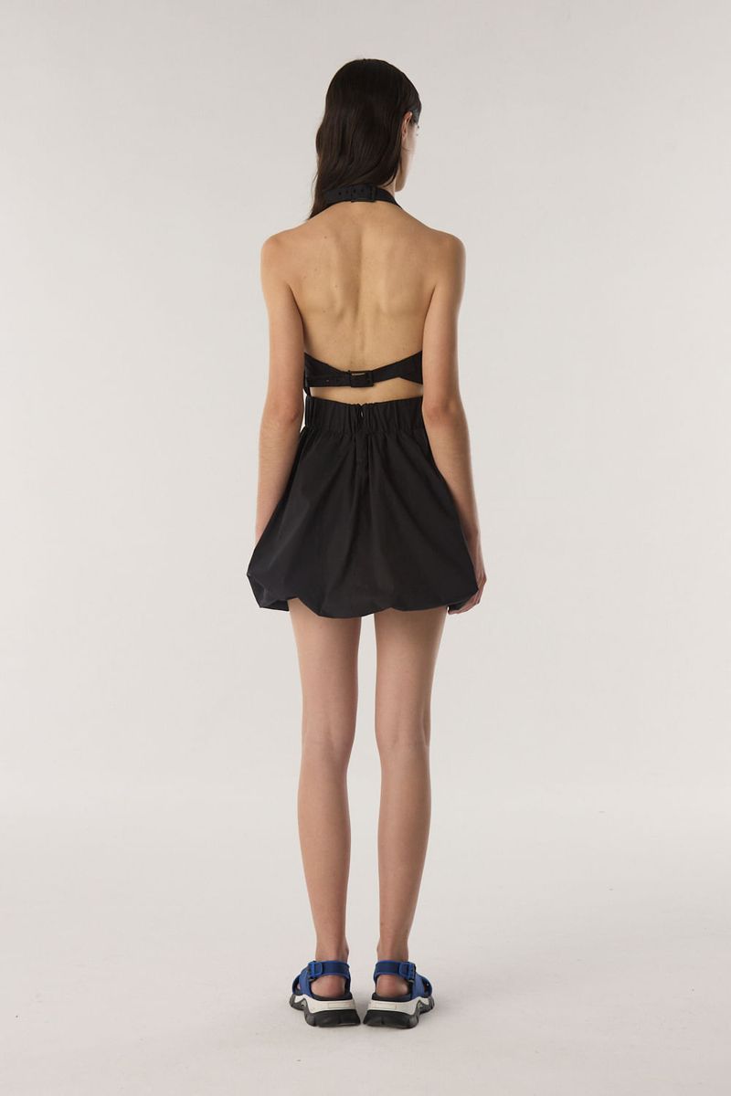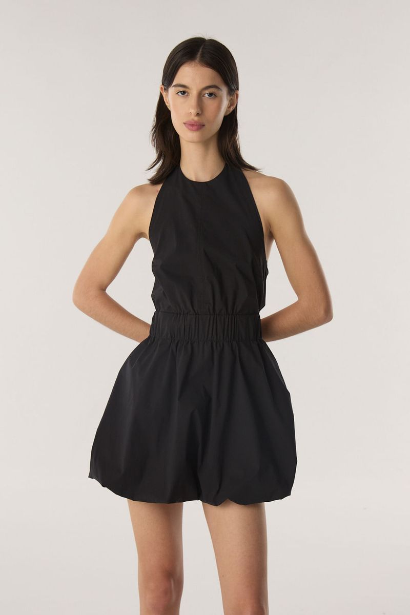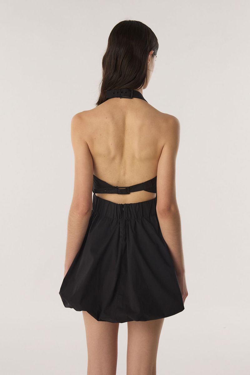 Vestido estilo halter con escote redondo y espalda al descubierto. Lleva hebillas en escote y espalda para cerrar. Con elástico en la cintura y falda silueta balloon. / Altura modelo: 1,77 m Talle: S / Composición: 65% algodón 33% poliamida 2% elastano - Forreria: 100% algodón / Origen: Importado
