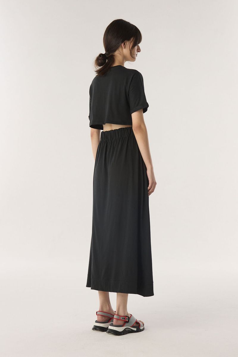 Vestido de tejido de algodón. Tiene cuello redondo, mangas cortas y detalle de apertura en espalda. Con elastico en la cintura, el calce es amplio en la parte inferior. /Altura modelo: 1,77 mt Talle S / Composición: 100% algodón / Origen: Nacional
